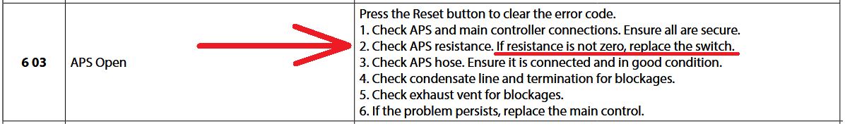 Again, the boiler is still currently running like nothing happened, and there are no error codes currently displayed. The APS OPEN 603 error code is indeed in the error log, though it is not currently shown on the screen.
