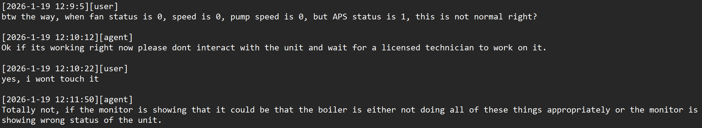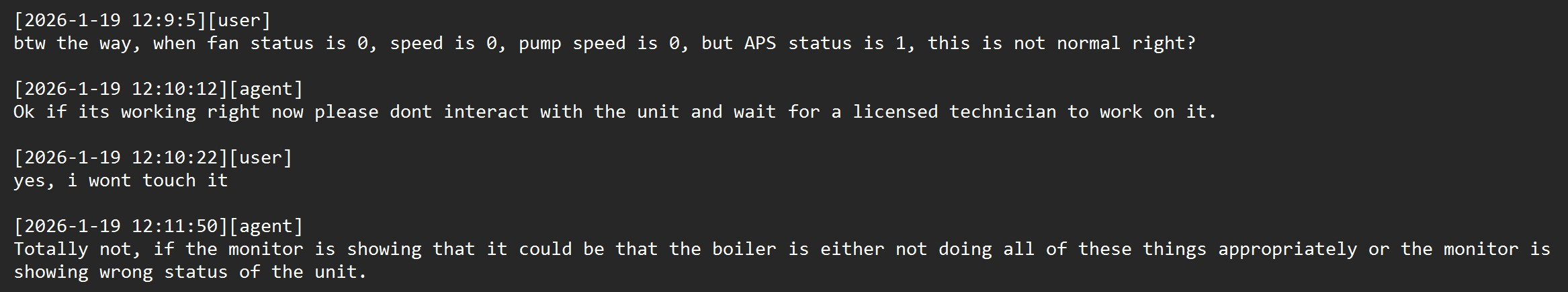 And again, here’s a transcript from the manufacturer stating that when the boiler is not running, the APS status should not be 1.