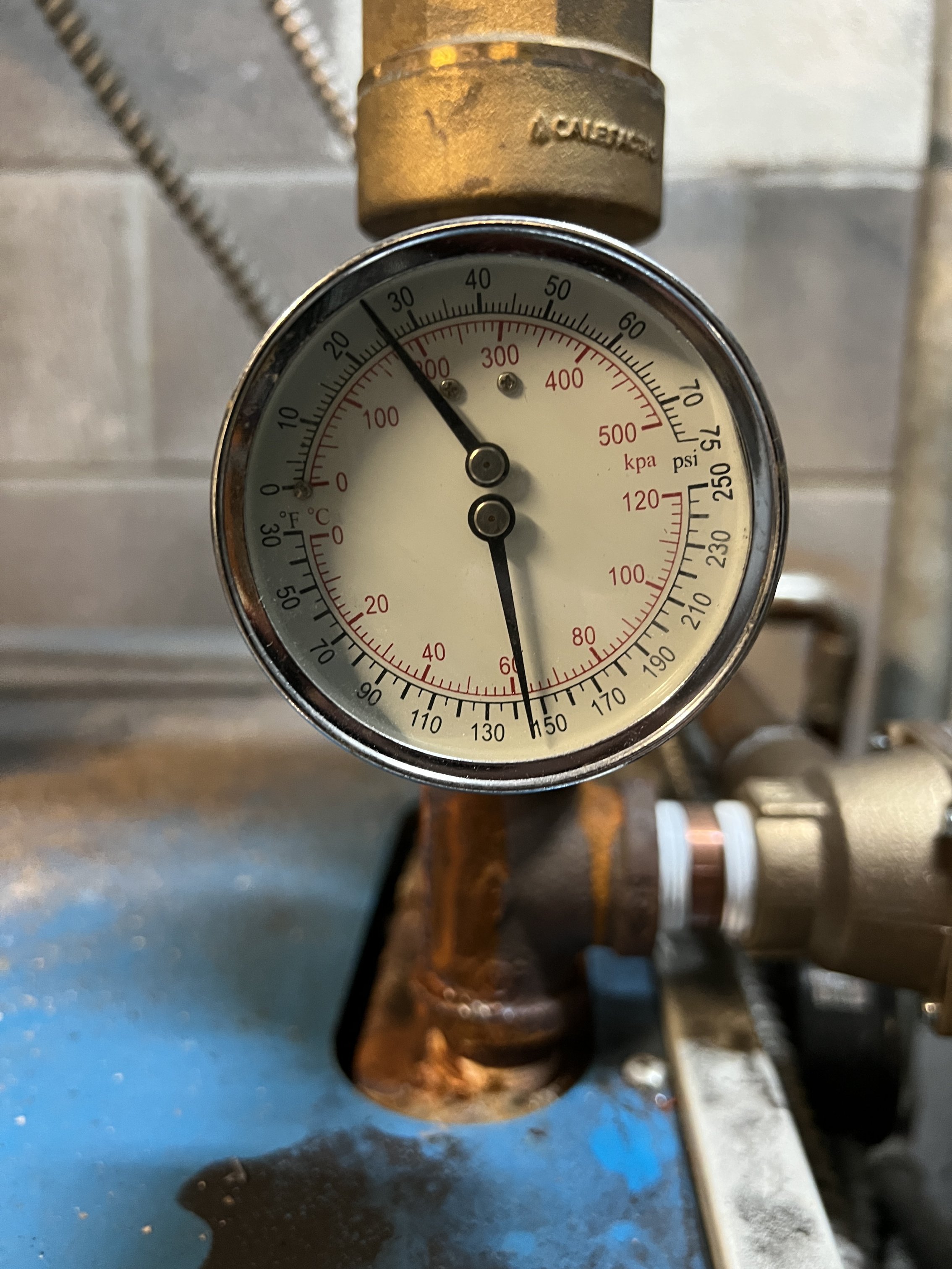 Seems like psi? This pic reads closer to 25. I'll check the pressure in the tank again and I'll bring out my hose bib pressure tester.