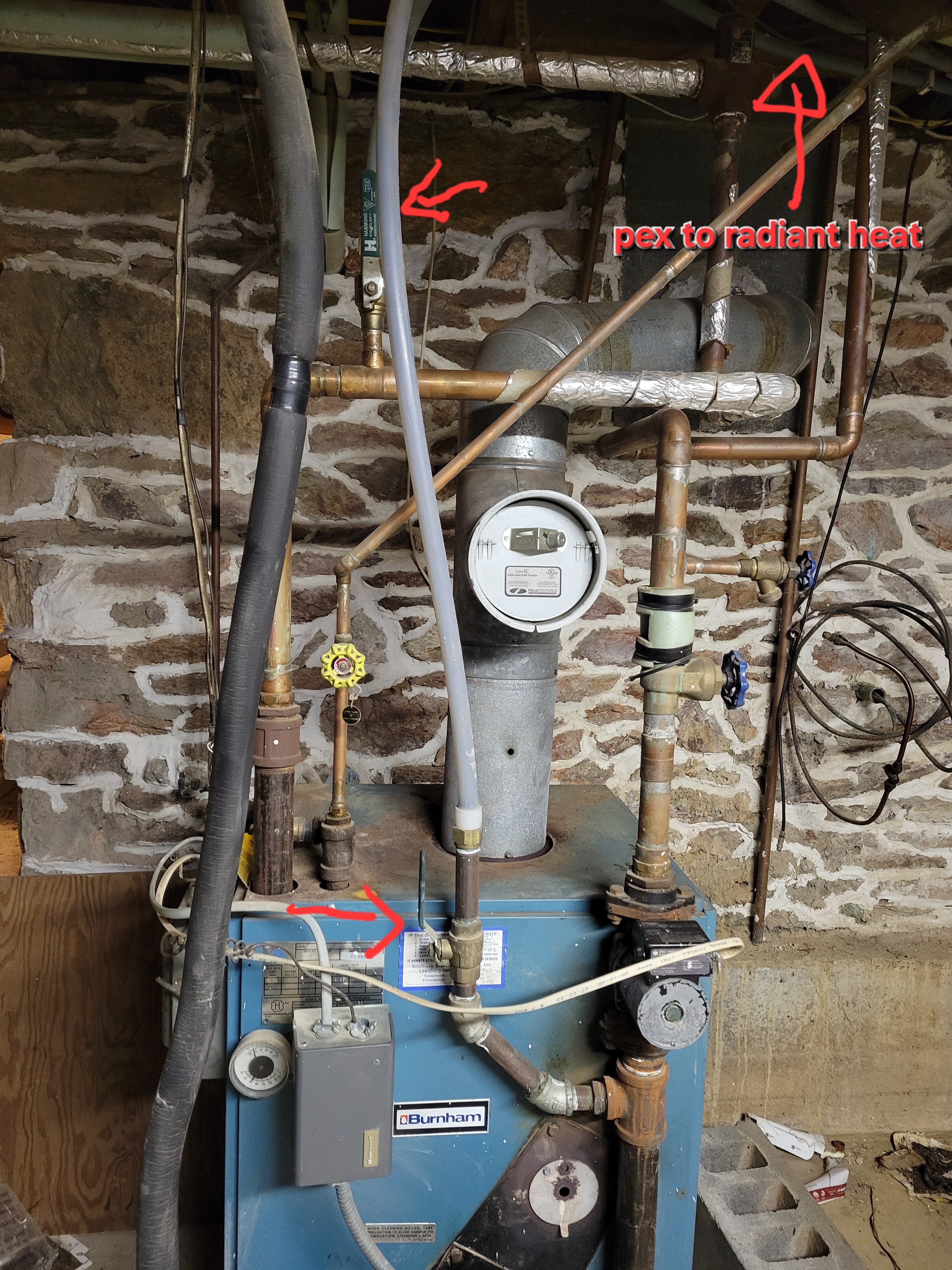 Real question here is that it appears that the intake and output valves at the boiler are closed. Im always a bit hesitant to just open valves. My question is for the radiant heating would opening those valves likely solve the radiant heat issue. Both valves noted in picture attached to the pex tubing that is run through the house to the radiant heat. Attached pics of