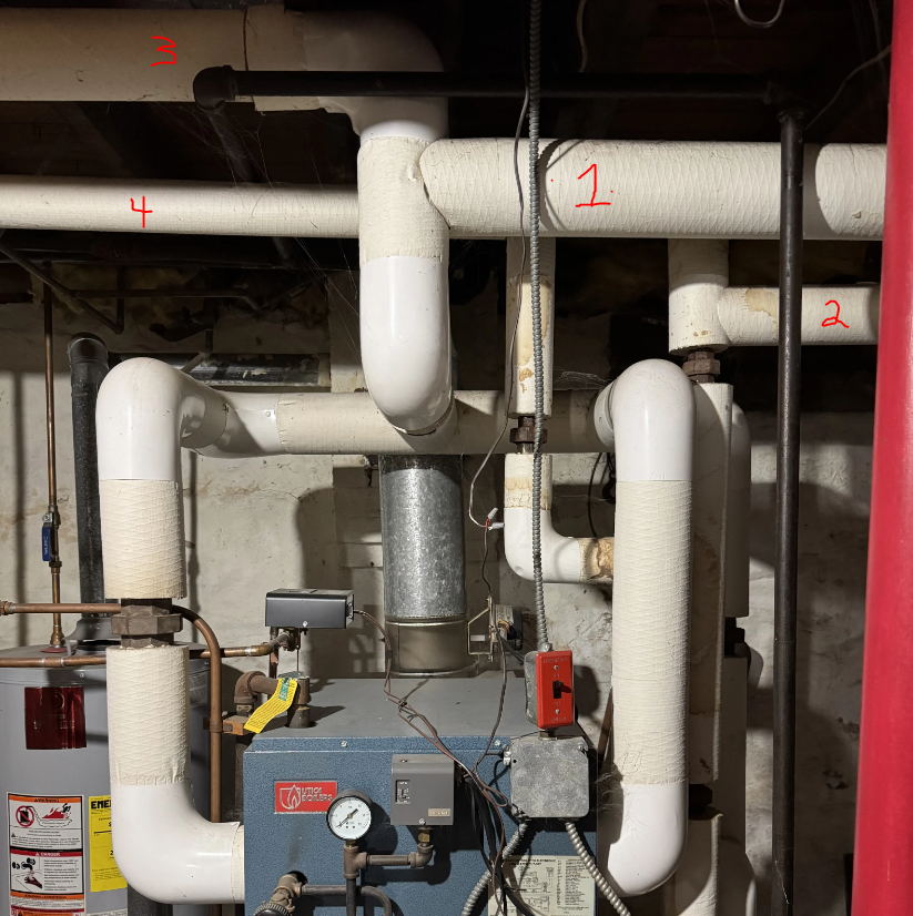 someone mentioned the length of the mains as well. It’s about 8’ of total pipe before it reaches the vents. After that if say about 20’ until it reaches the closest radiator.