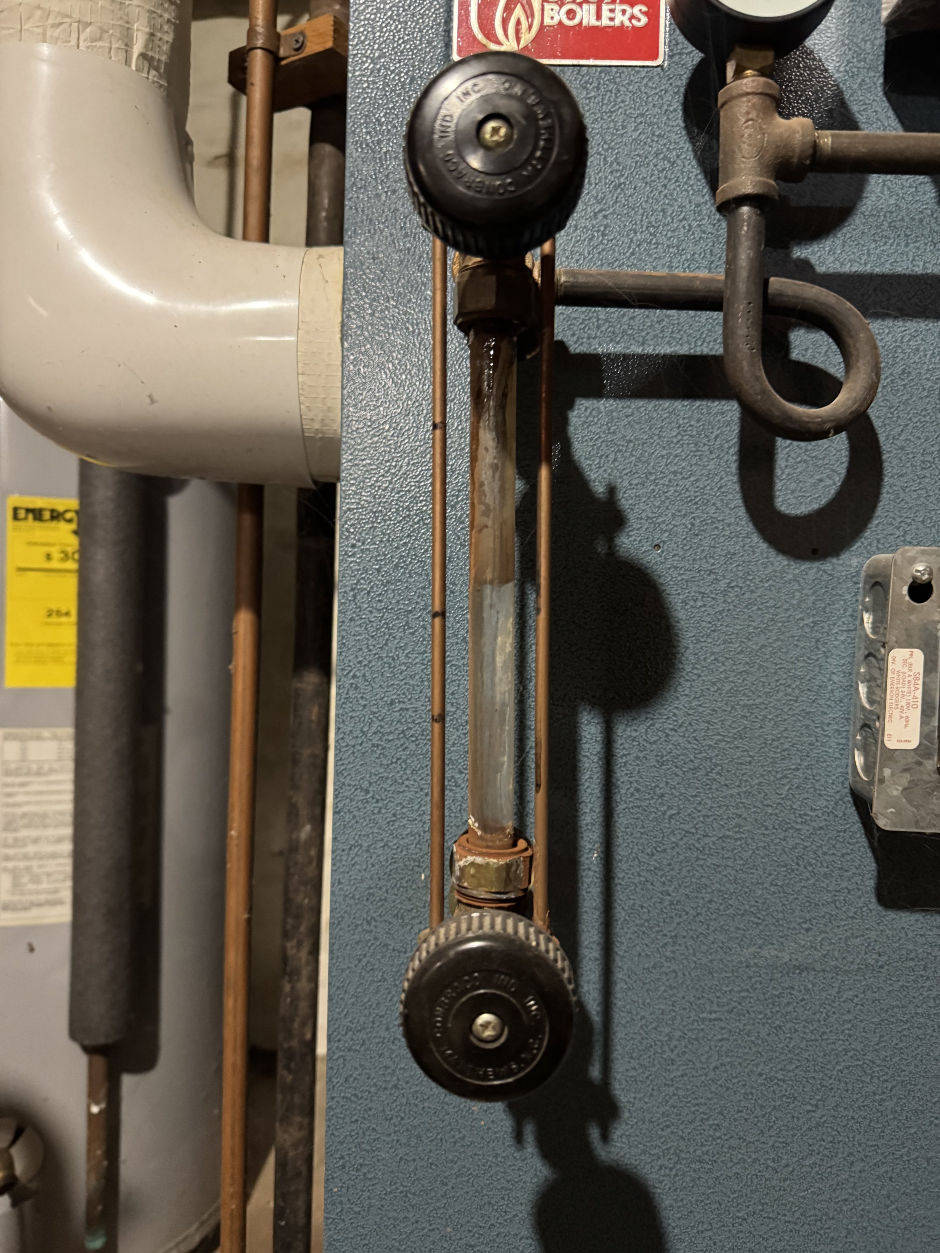 siteglass so we see the water, when the boiler is firing, does the water level bounce much? more than an inch? does water wash down inside the glass from the upper fitting? both point at poor water quality, and could lead to some of the issues you wrote of, good that you see the level between the markings,