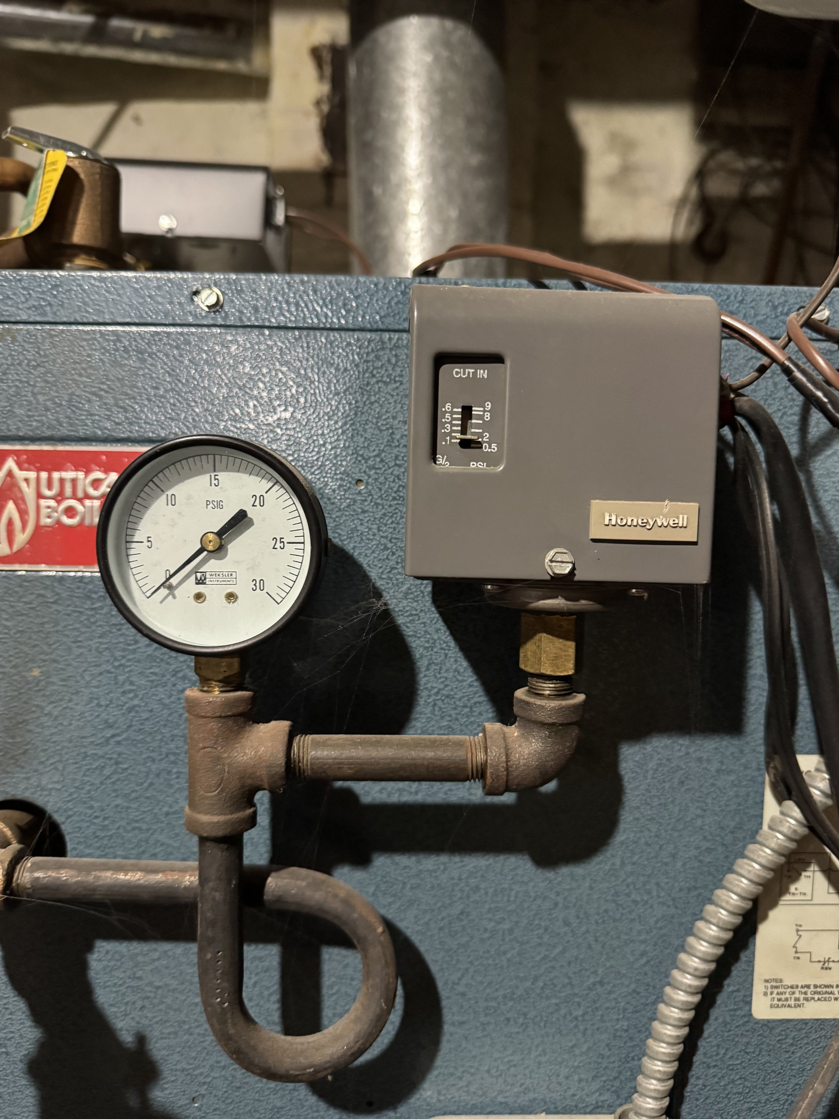 your pressuretrol (the gray box). is set too high. right now it's set to around 2-3psi (plus 1psi of internal differential). this means your ptrol wont shut down your boiler until around 4psi (assuming it s working correctly in the first place). those are very easy control devices. you can set/fix it yourself.