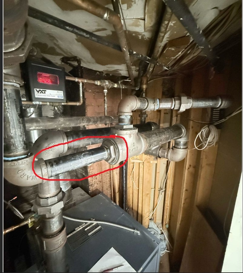 Home built in 1900. I’ve had near boiler piping repiped, but it still bangs tremendously. It is: two pipe, gravity return, no traps, I have found check valves at the returns of the radiators underneath floor boards, one main vent in basement (Hoffman 75H), boiler running .5 psi, each radiator has one Hoffman 1A vent. The boiler is toward the front of the house. Banging is only toward the rear of the house with the longer main. The shorter main has no banging. Shorter main is 15ft, longer is 40ft. There is clicking at the radiators and the banging from the longer main comes up through the pipes. Banging is at the beginning of the cycle. All radiators properly pitched. I have not found any traps or other vents. 15ft main return pipe mostly stays cool except for the pipe closer to the boiler. Long return pipe with Hoffman 75H vent is piping hot and I think that is the issue. What can I do to stop the banging? Water line to wet return is 5”, water line to main vent is 58”, water line to headers is 45”.