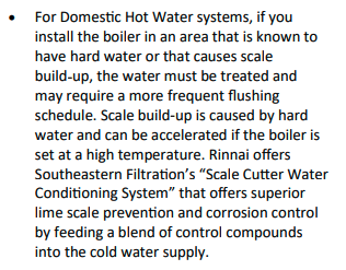 Rinnai shows a water quality spec for the water in the boiler itself. Also a mention of using the scale cutter, but no water spec for the potable water side.