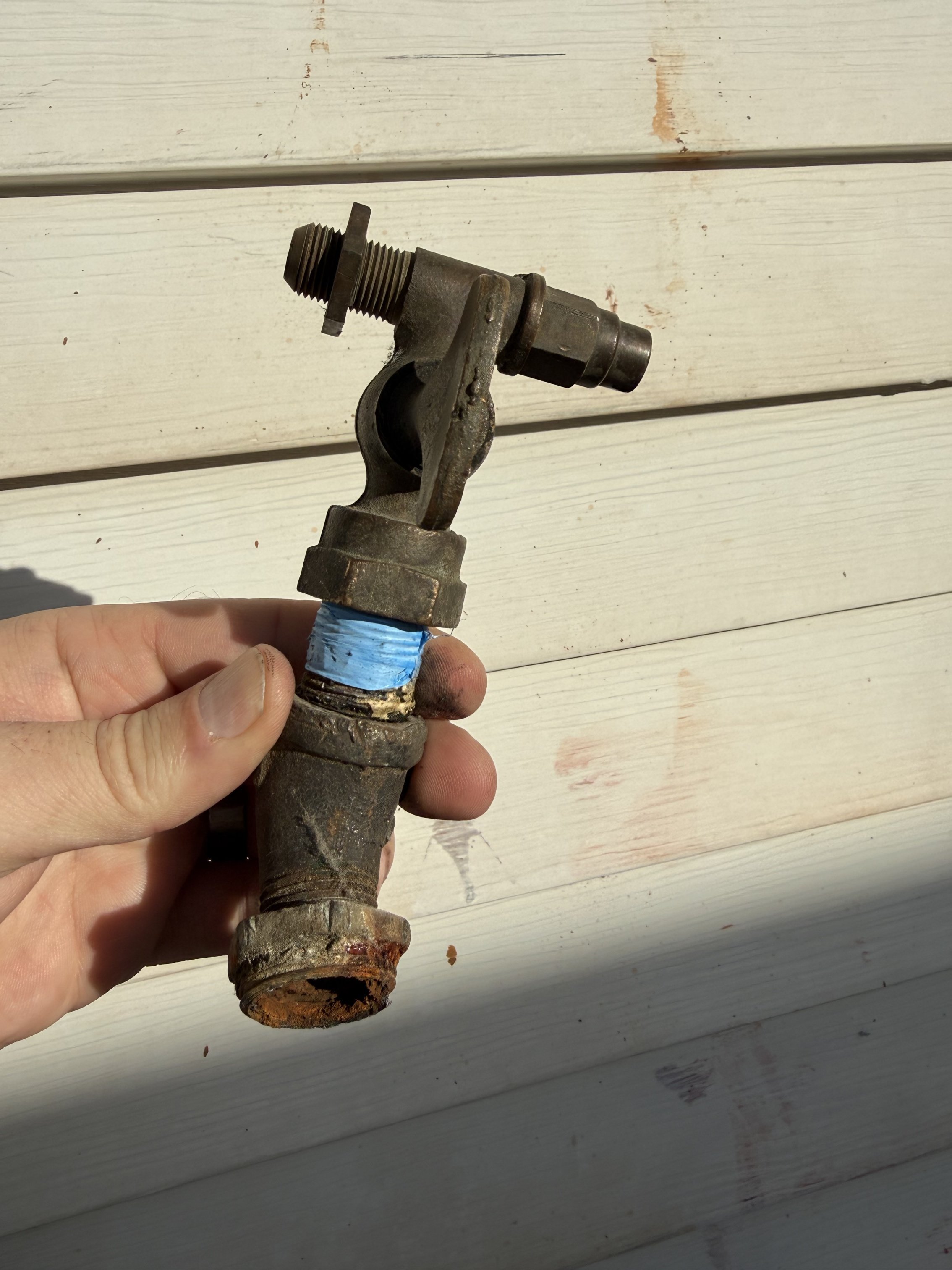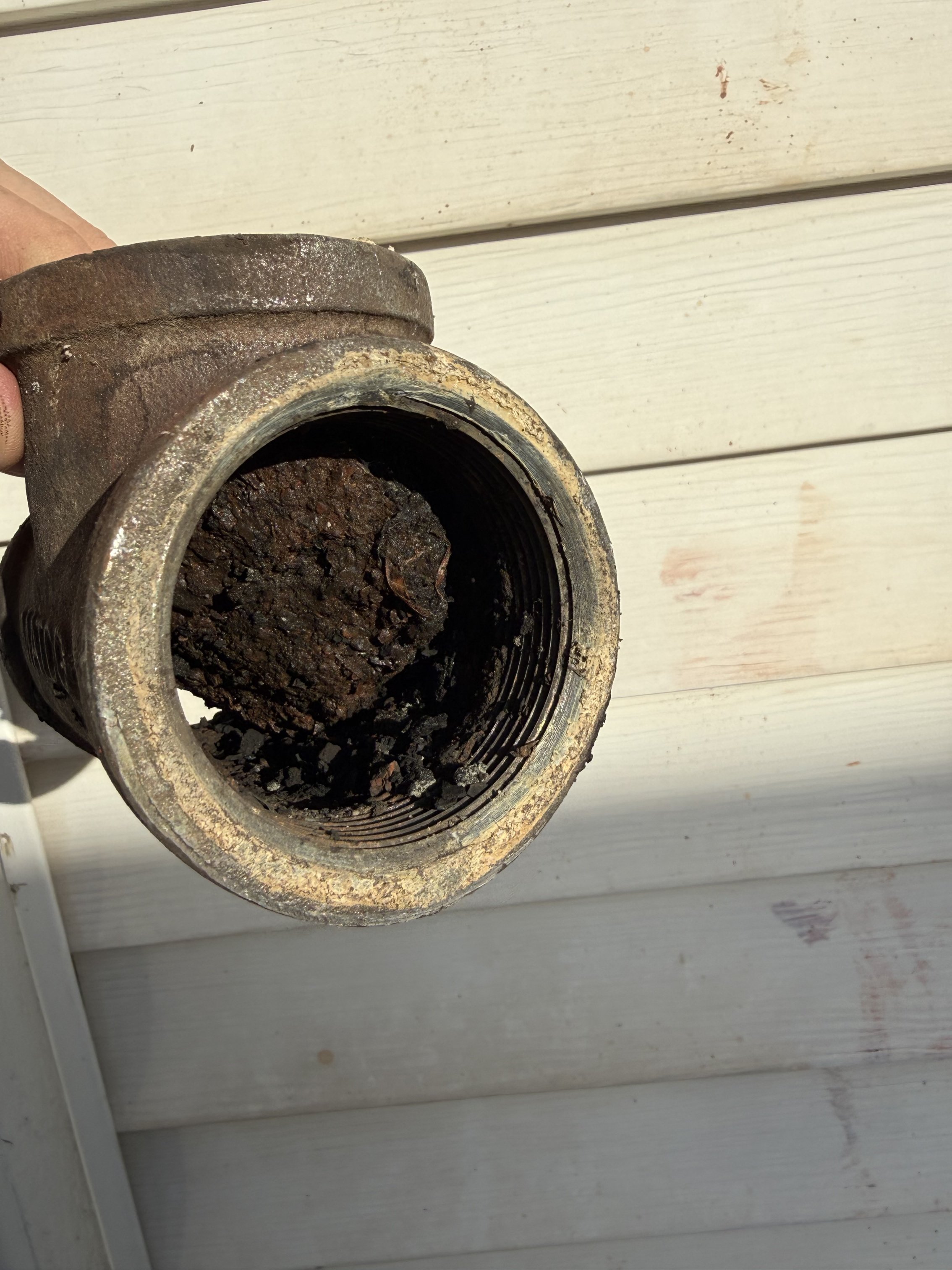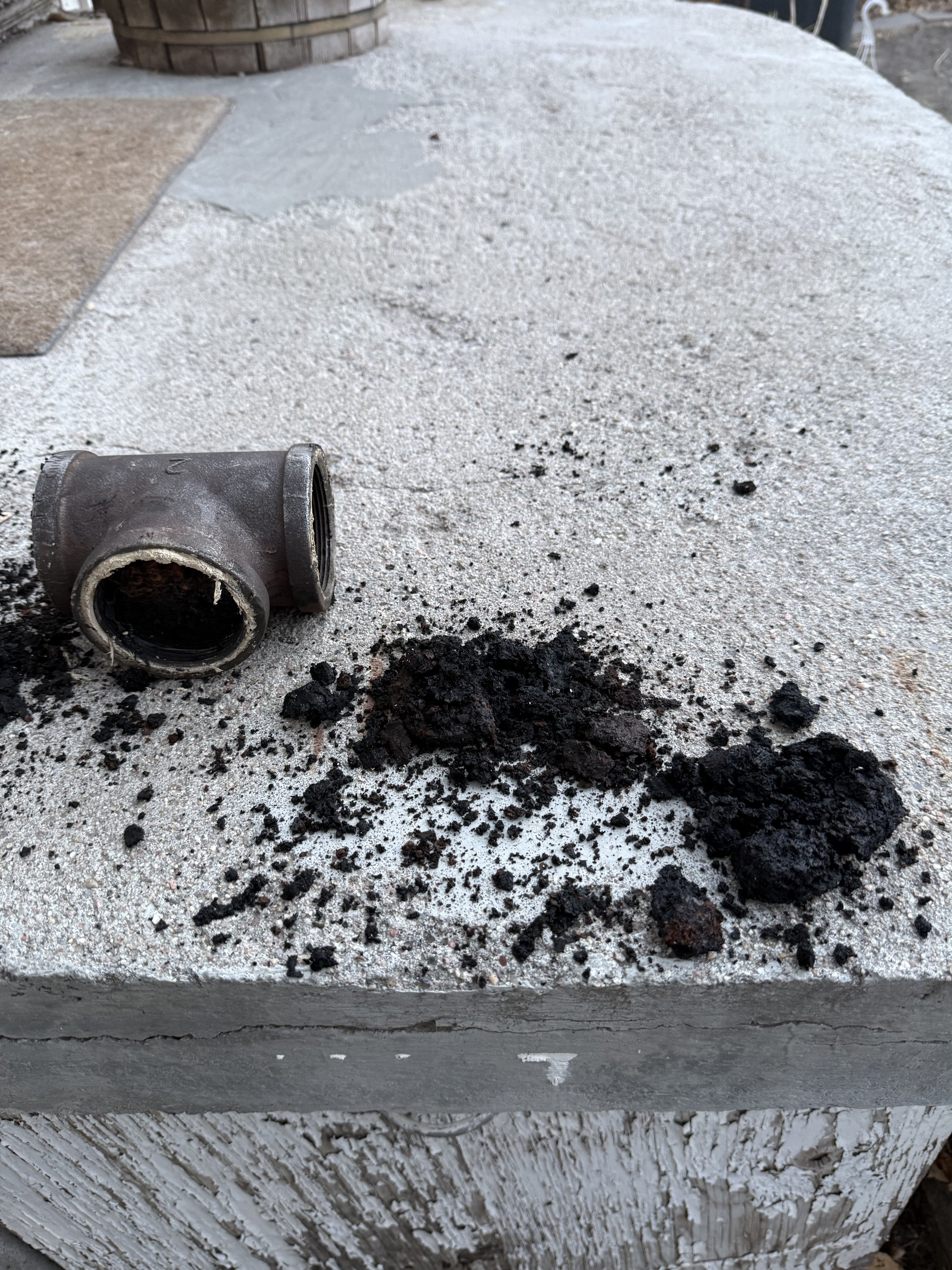 i would like to see an autopsy of whatever that is blocking the tee. it could be scale that came loose from somewhere but it kind of looks like a piece of sheetmetal or something that got in there or came loose from something somehow and got plated with rust.