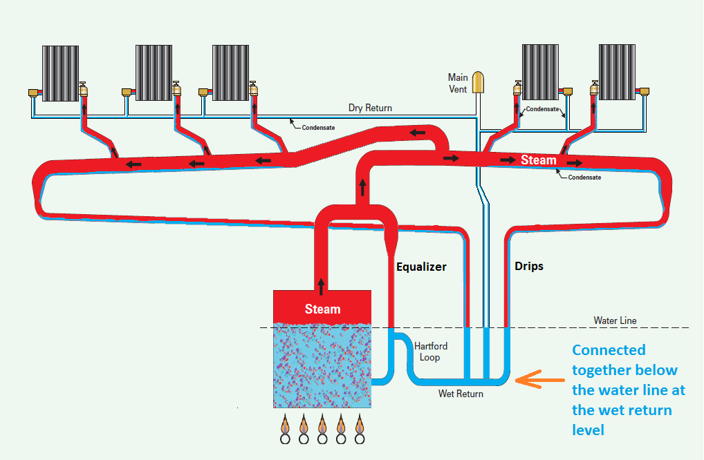 I thought I posted this image example below in the other thread (I have not gone back and looked yet). Look at the piping below the water line (it provides isolation so steam can't pass) and the Hartford loop to the equalizer connection (siphon break).