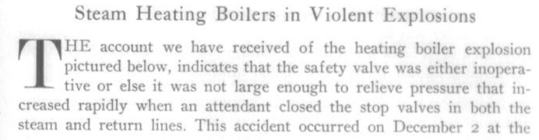 Our host, Dan Holohan, has done a lot of this research, and I am willing to take his word for it. According to his statements in many a steam seminar, it appears that boiler explosions were reported (not if, but) by how many occurred in a given week in some large metropolitan cities—like baseball box scores. They were a way of life at the turn of the century, just like seeing the farm report, or the weather forecast for tomorrow, or which horse and buggy ended up in a collision with one of these new-fangled horseless carriage things. The news of the day always included the number of boiler explosions that were going on in the places we lived.