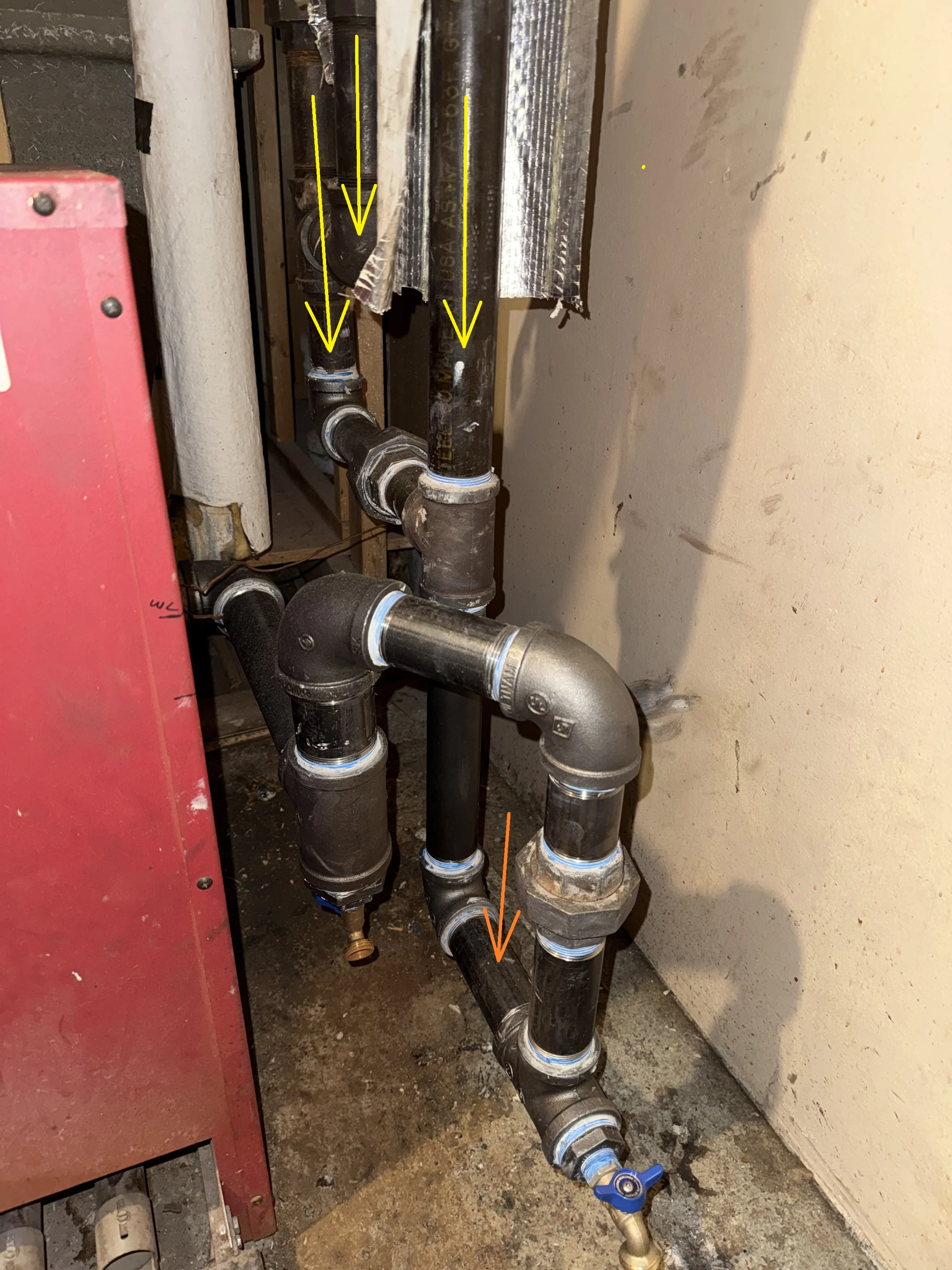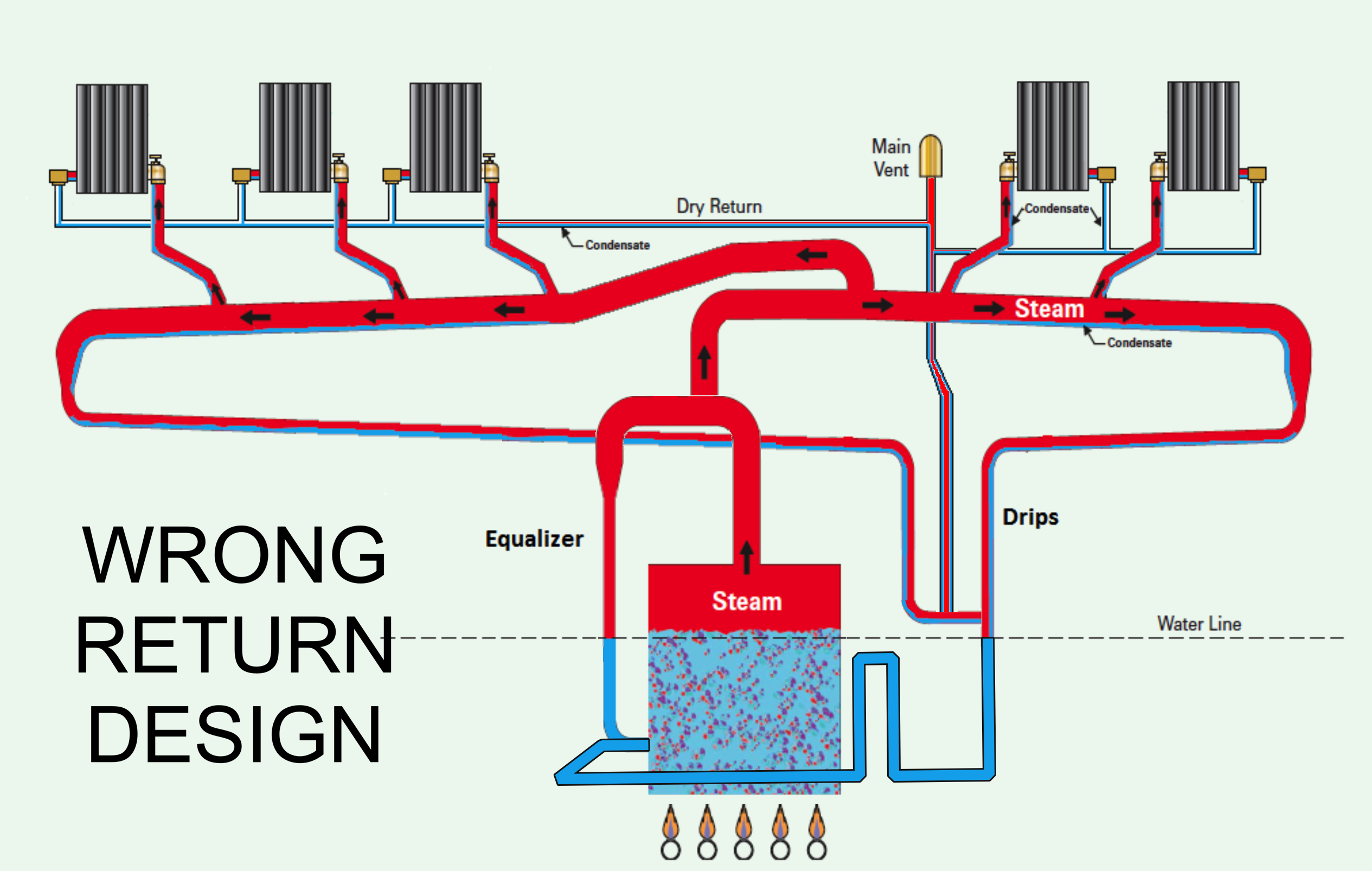 In the @109A_5 yellow-arrow photo, the three return drops are above the water line, which allows steam to pass from one return drip to another. They need to connect below the water line so a water seal prevents that cross-connection.