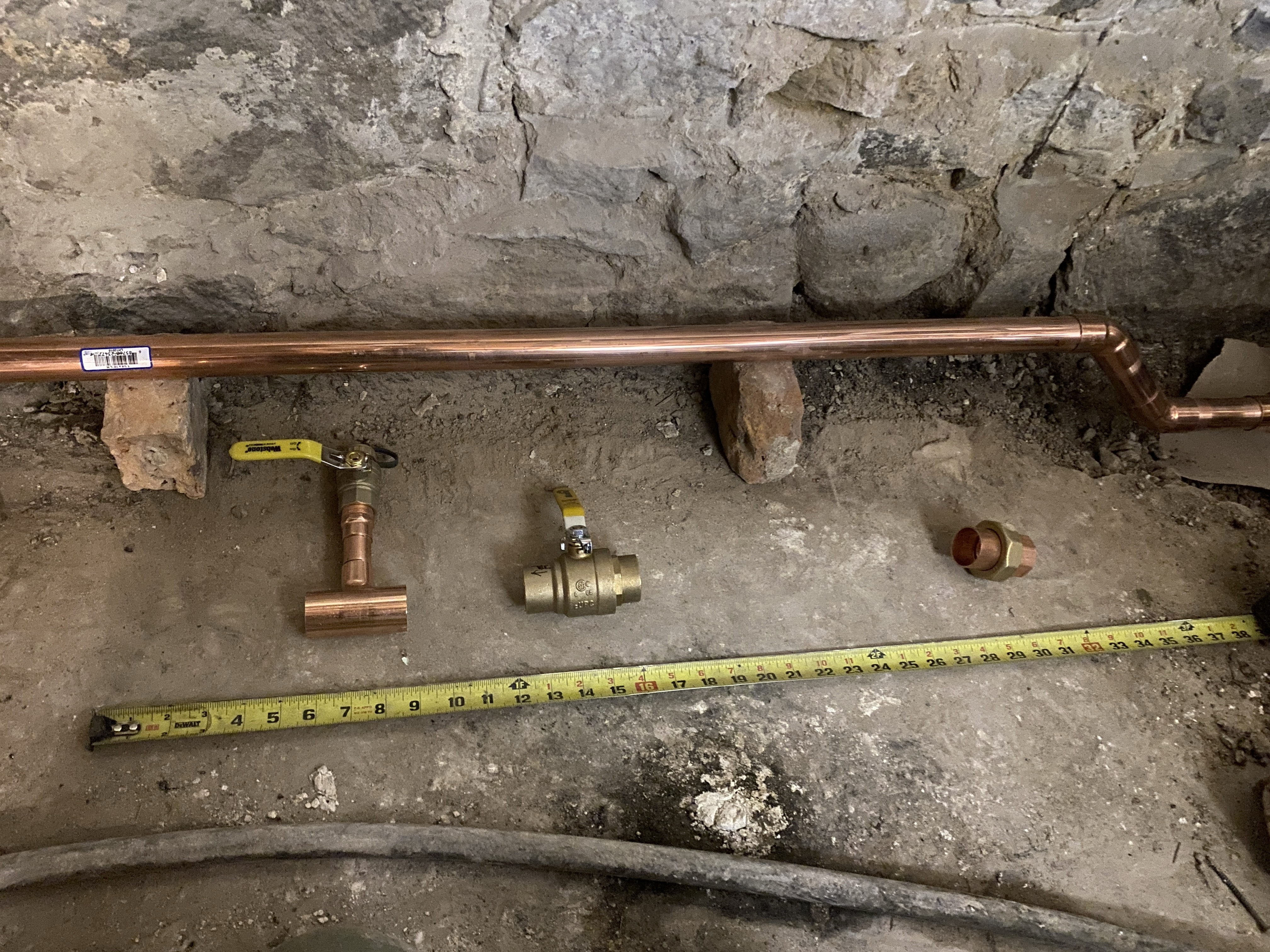 Started dry fitting the copper. After the 45 offset, I'll put on a union —> isolation ball valve —> hose attachment off a tee.