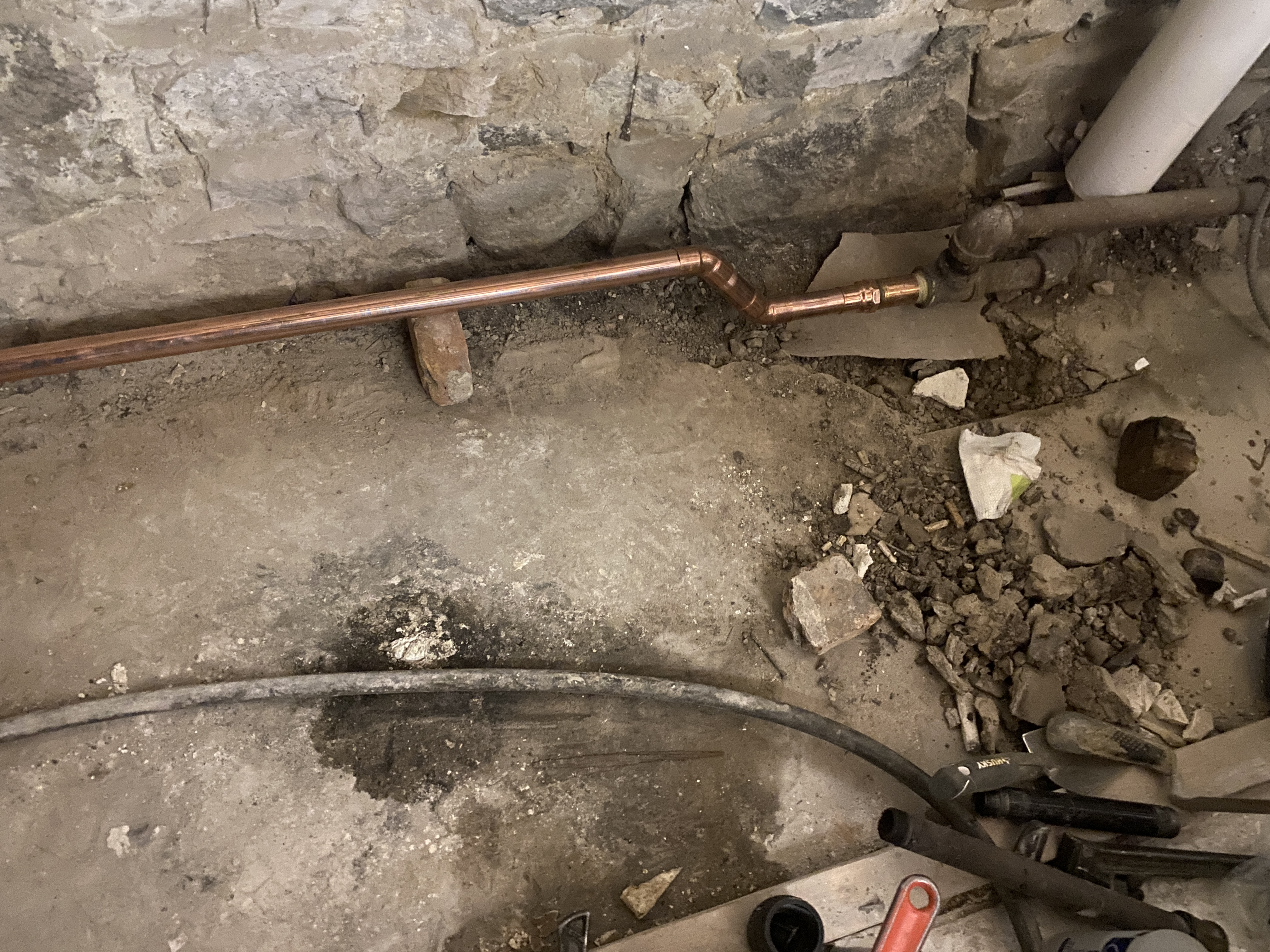 I dug up the underground section near the boiler. Looks like they went copper to a black 90 back to copper and back to black pipe underground. It is what it is.