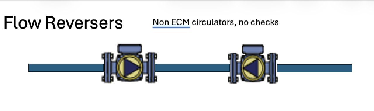 Flow reversal with two circulators. I tried this with two ECM inline, but the one that was powered off would flash weird displays when un-powered and rotated backwards :)