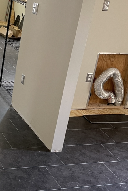My washer and dryer are in a laundry closet in the kitchen. I am replacing both and have a challenge with fitting the new dryer. To put it simple, the duct comes into the closet vertically through the floor. A 4" adjustable elbow was used to go from the vertical outlet of the duct to the horizontal connection on the dryer. That takes up 4+ inches of the floor space. Between the wall and the back of the dryer.