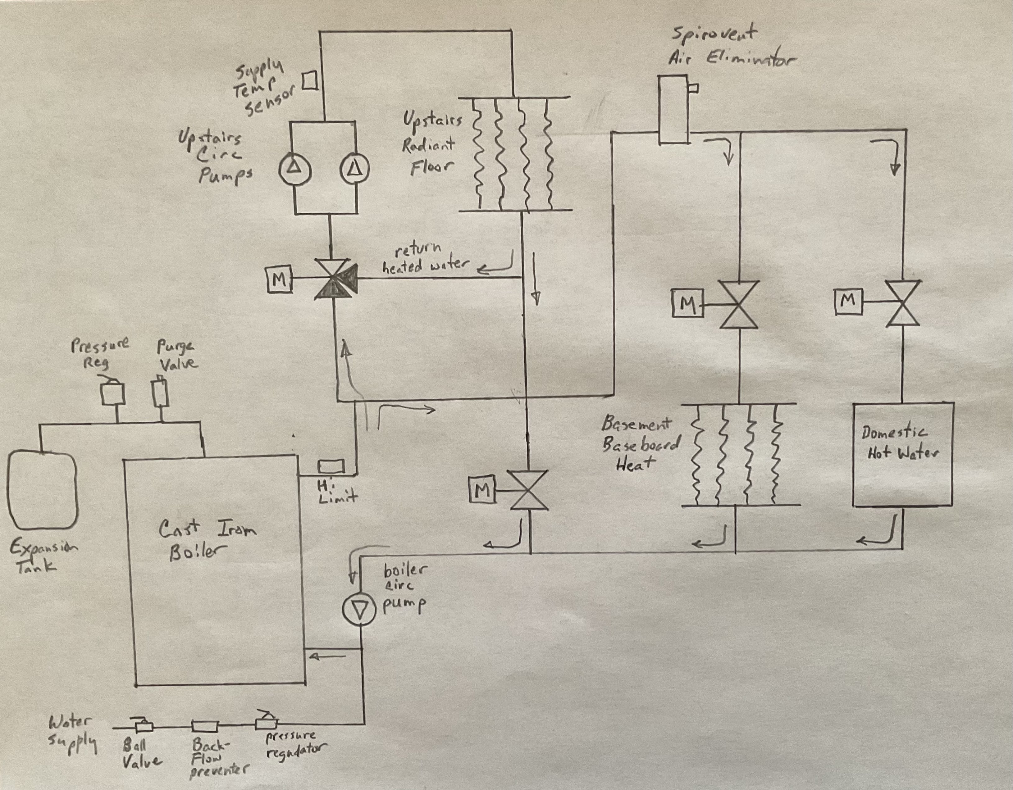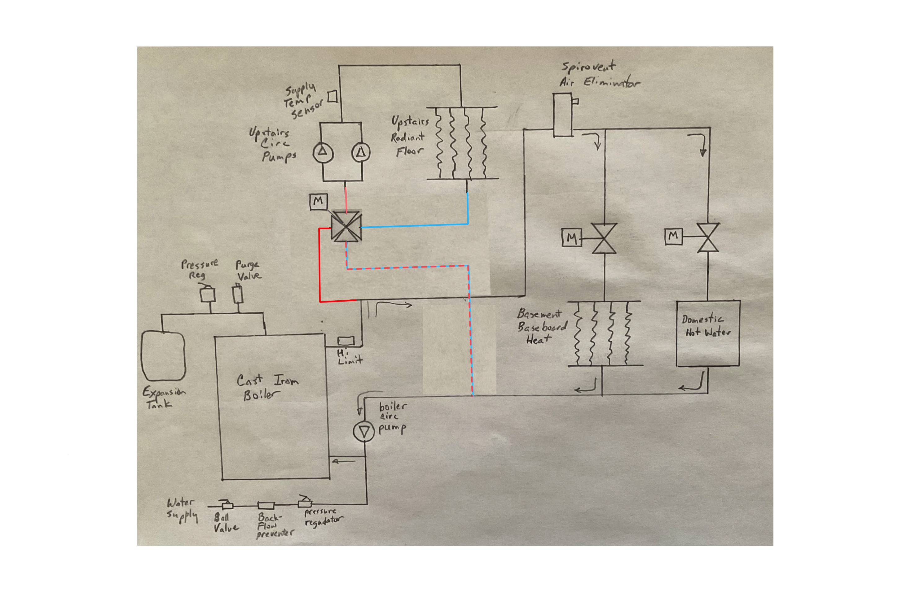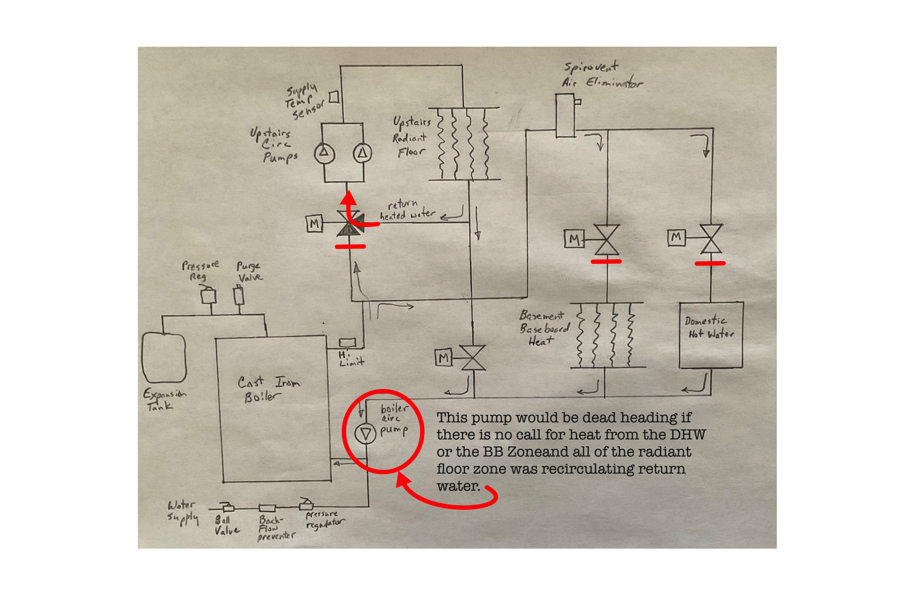 My house was built in 1993, we purchased it in 1996 (30 years ago). We have 3 heating loops: radiant floor heat upstairs, baseboard heat downstairs and a domestic hot water tank. Heated water is supplied by a cast iron boiler. We have been very happy with our system and it has been operating fine. My understanding of this system has slowly increased over the years.