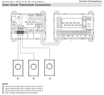 My question is, does anyone know where I can connect two new thermostats, since there are only a total of (3) dry contacts at the boiler DE1, DE2 & DE3 connections and I don’t see a Tstat connection point on the AM1 module itself ? I have emailed Viessmann a few times over the last month asking this question and I haven't been able to get a response yet.