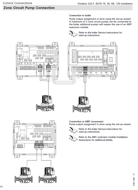 Hi, I have a Viessmann 222-F Model B2TB 125 Boiler that I had installed in April 2020. It's been a great boiler with no issues. I currently have two circulating pumps, each for an in-floor radiant heat zone and they each have their own thermostat and these are working fine. I recently purchased the AM1 extension module, since I want to add two more circulating pumps for two new in floor radiant heat zones that I want to add.