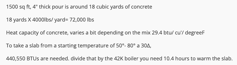The below example shows how many hours to warm a 1500sq ft slab with a 42,000 boiler input
