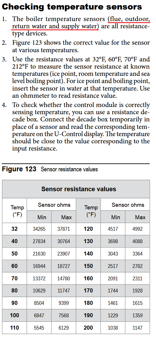 There would be a chart for the outdoor sensor if it was a different resistance profile.