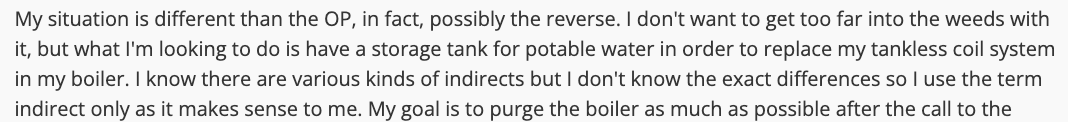 My situation is different than the OP, in fact, possibly the reverse. I don't want to get too far into the weeds with it, but what I'm looking to do is have a storage tank for potable water in order to replace my tankless coil system in my boiler. I know there are various kinds of indirects but I don't know the exact differences so I use the term indirect only as it makes sense to me. My goal is to purge the boiler as much as possible after the call to the indirect, and store all that hot water in a better insulated place than my boiler, and not get a low limit call just because someone decides to wash the dishes on a summer day and have the whole system fire up for a few degrees.