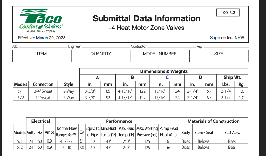 OP here.. OK; here's all the math! —-first off, the assumptions in my model (please indicate where I might be wrong).. —> every 100feet of linear pipe introduces 5feet of head. —>Each elbow introduces 2feet of equiv linear pipe. —> The Taco model 572 Zone Valve Body (1") introduces 60 feet of equiv linear pipe. —>I didn't bother with Static Head to get up to the 2nd floor, because this is a closed-loop, and what-goes-up, must-come-down, so it's a wash as far as head goes. —>my Fin-Tubing emits 850BTUh per foot, at 180F water temp, at 4GPM.