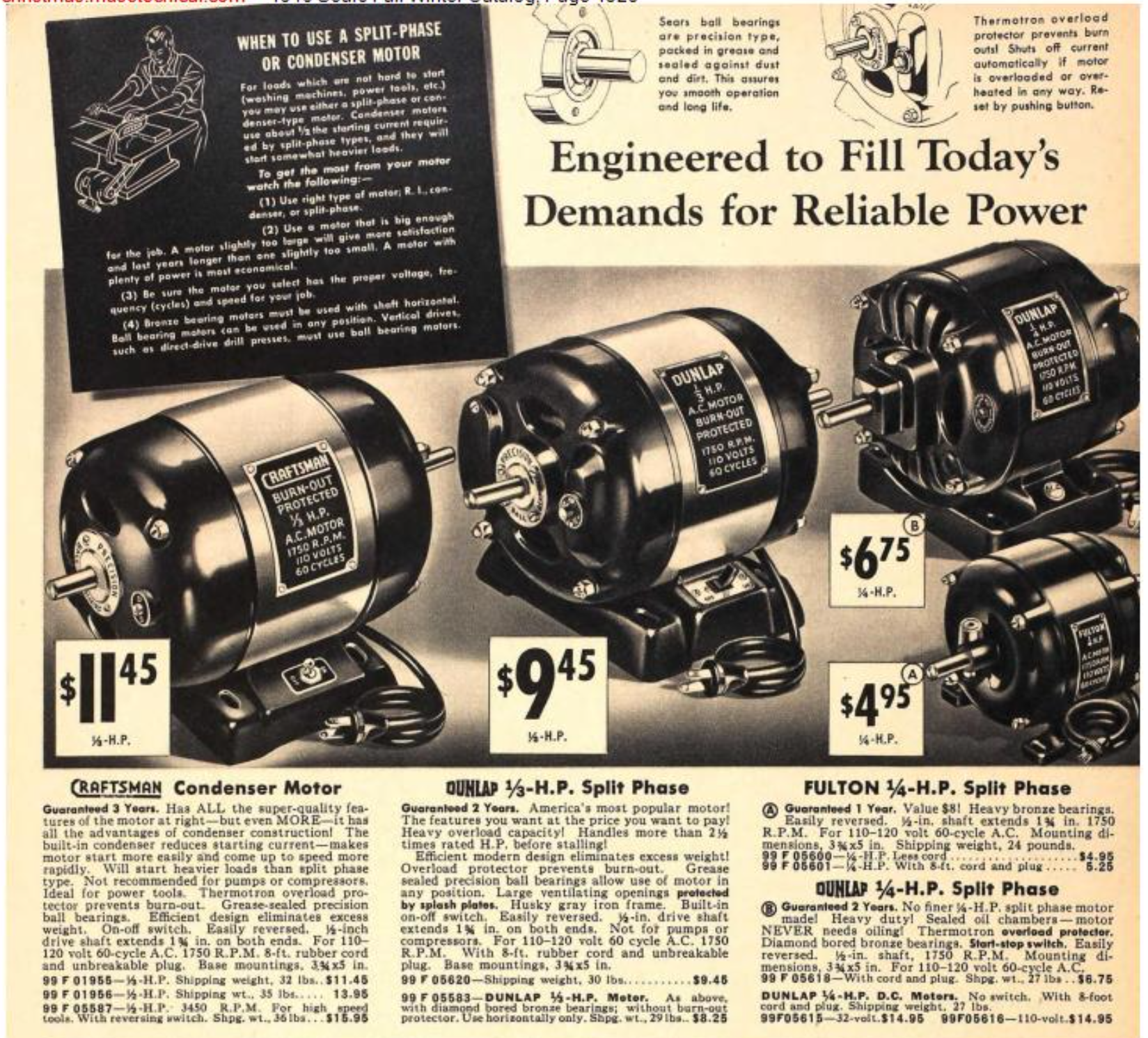 it still works fine. i had to replace the thrust bearing that was worn out and take the chuck apart and clean and re-lubricate it but it otherwise was fine. my grandfather replaced the motor at some point, i think the original motor might have been a repulsion start motor, i'd have to look at the next page to see what motor it references. the fact that it was available with an idler to turn the belt up to a line drive says a lot.
