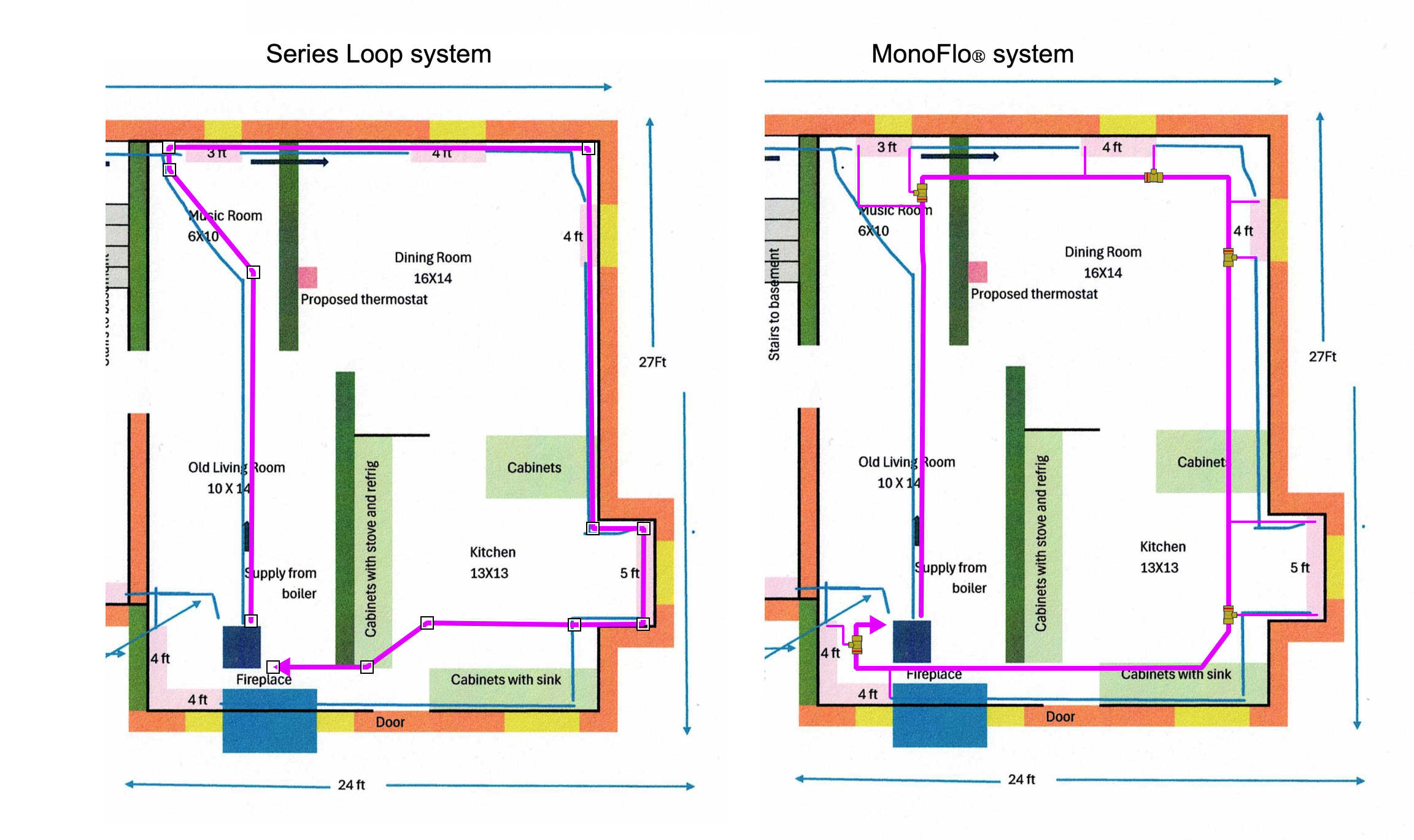 I will point out the difference in the following diagram. the violet lines are the 3/4" main pipe in the series loop and the MonoFlo® diagrams. On the Left MonoFlo® diagram you can see the tee locations on each radiator takeoff and the smaller 1/2" take off pipes from each tee branch.