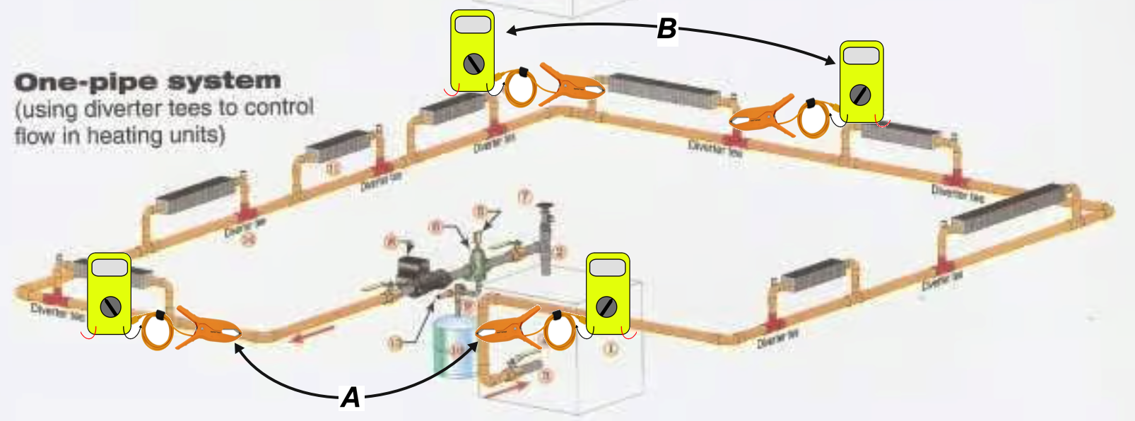 Here are the two places you want to measure the temperature difference (ΔT). A is the complete system ΔT, and B is the individual radiator ΔT. You should measure B on all the radiators to properly diagnose your system.
