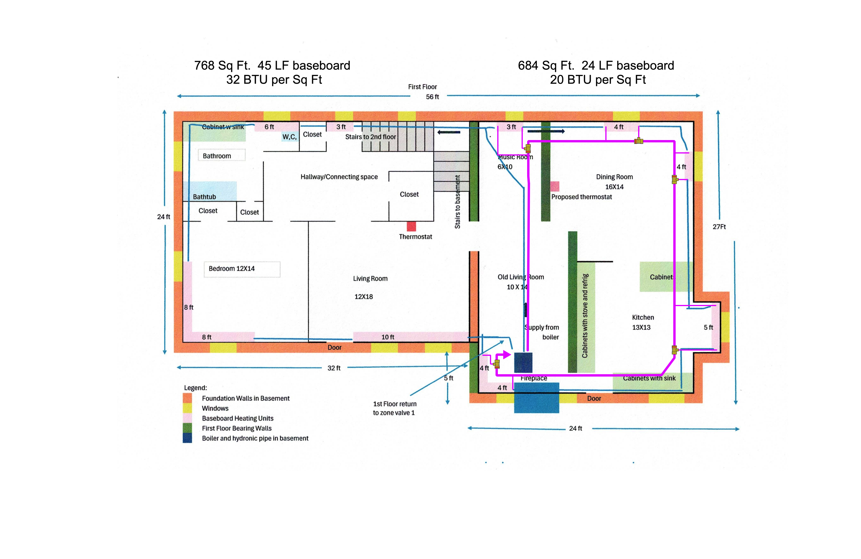 My next observation is that the newer area has more radiator capacity per square foot than the older area. This seems counterintuitive, as one might expect the older area—likely having less insulation—to require more radiator capacity per square foot.