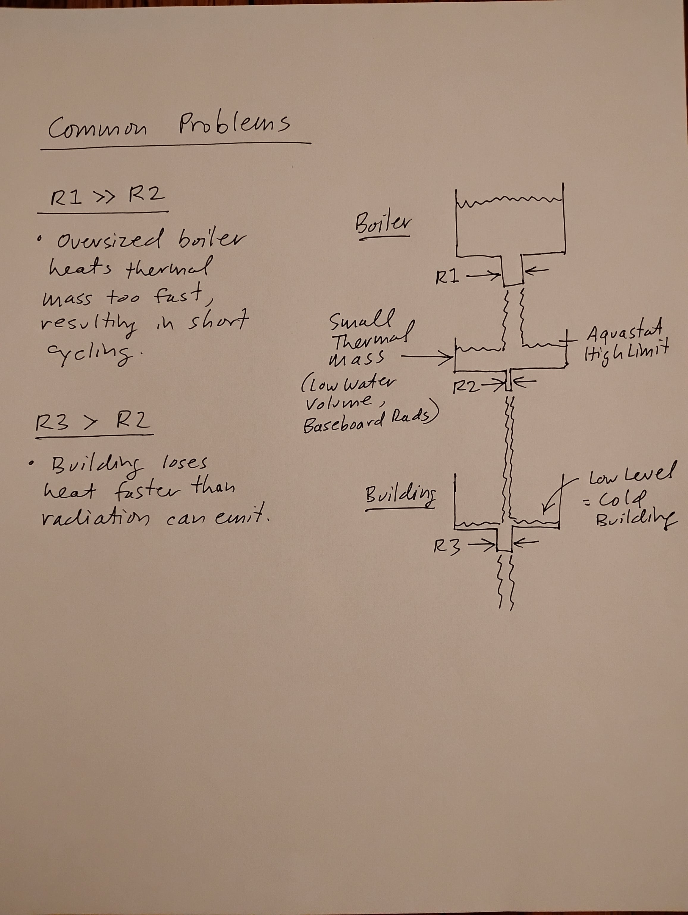 Common problems seen here at HH happen when R1> >R2, when an oversized boiler heats a small thermal mass too fast, resulting in short cycling, and when R3 > R2, meaning the building loses heat faster than insufficient radiation can emit.