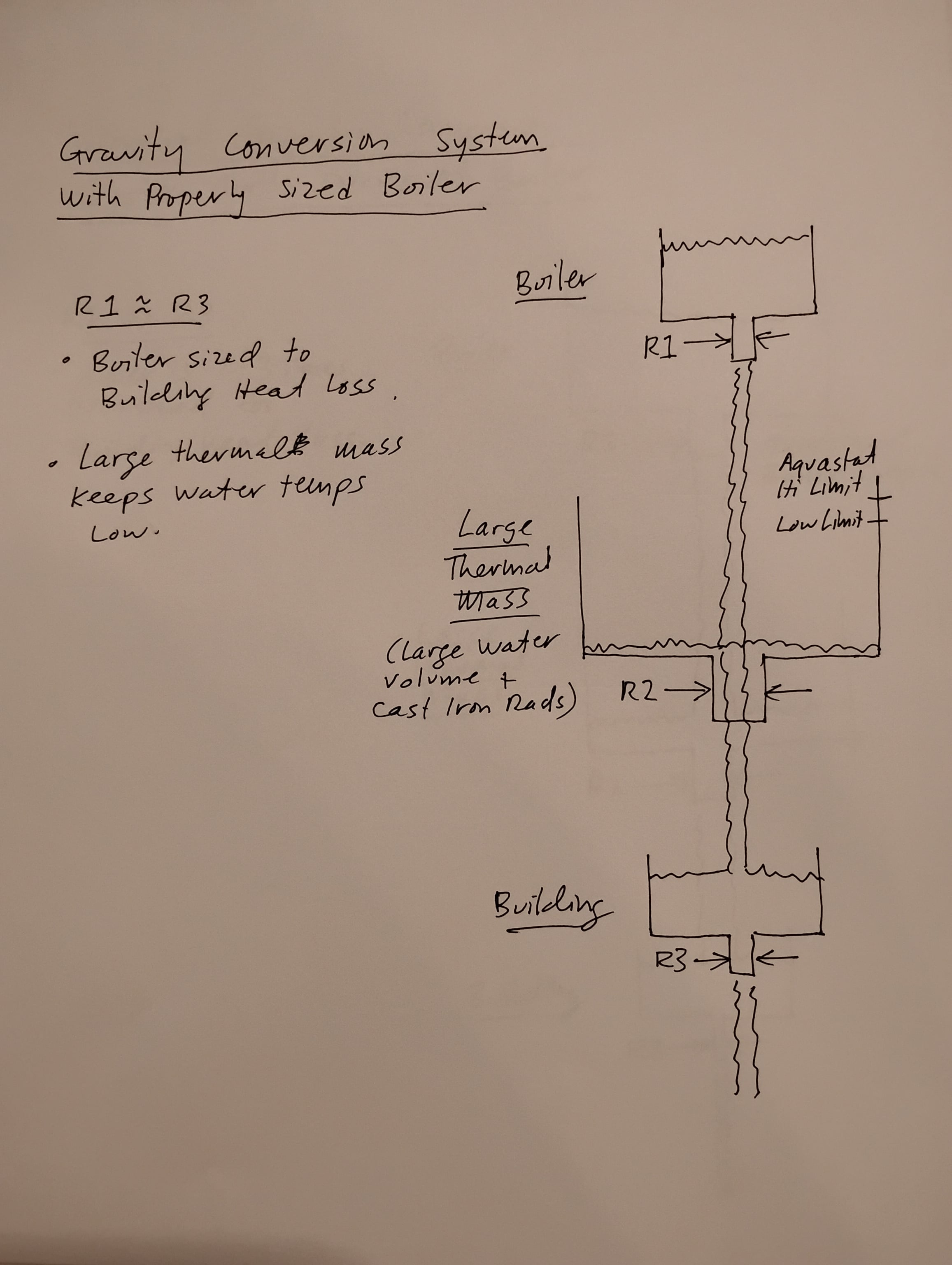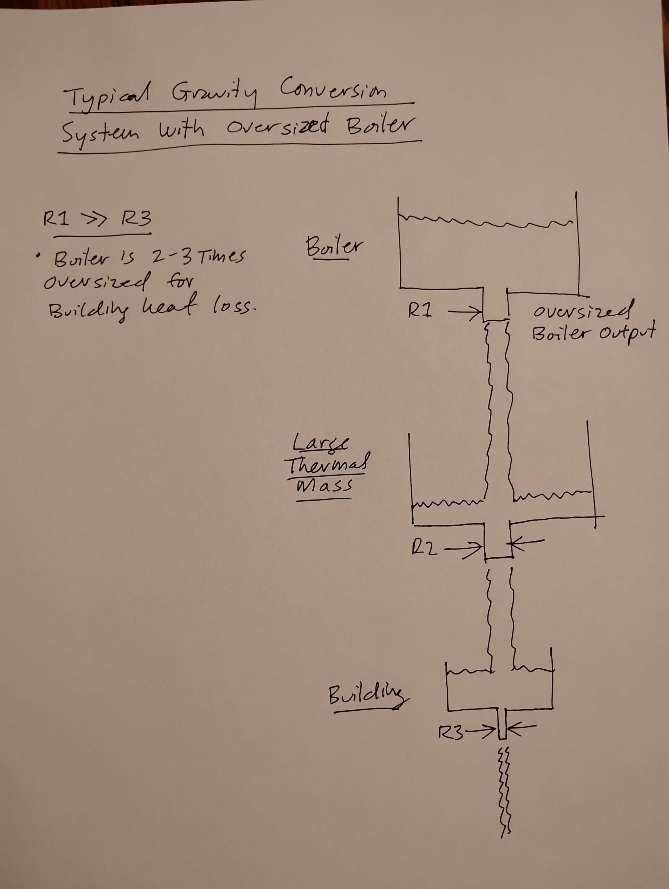 But commonly we see gravity conversion systems with massively oversized boilers. This is the case in my 4-unit condo building. Here we have R1> >R3, where the boiler output rate is 2-3 times the building heat loss rate.