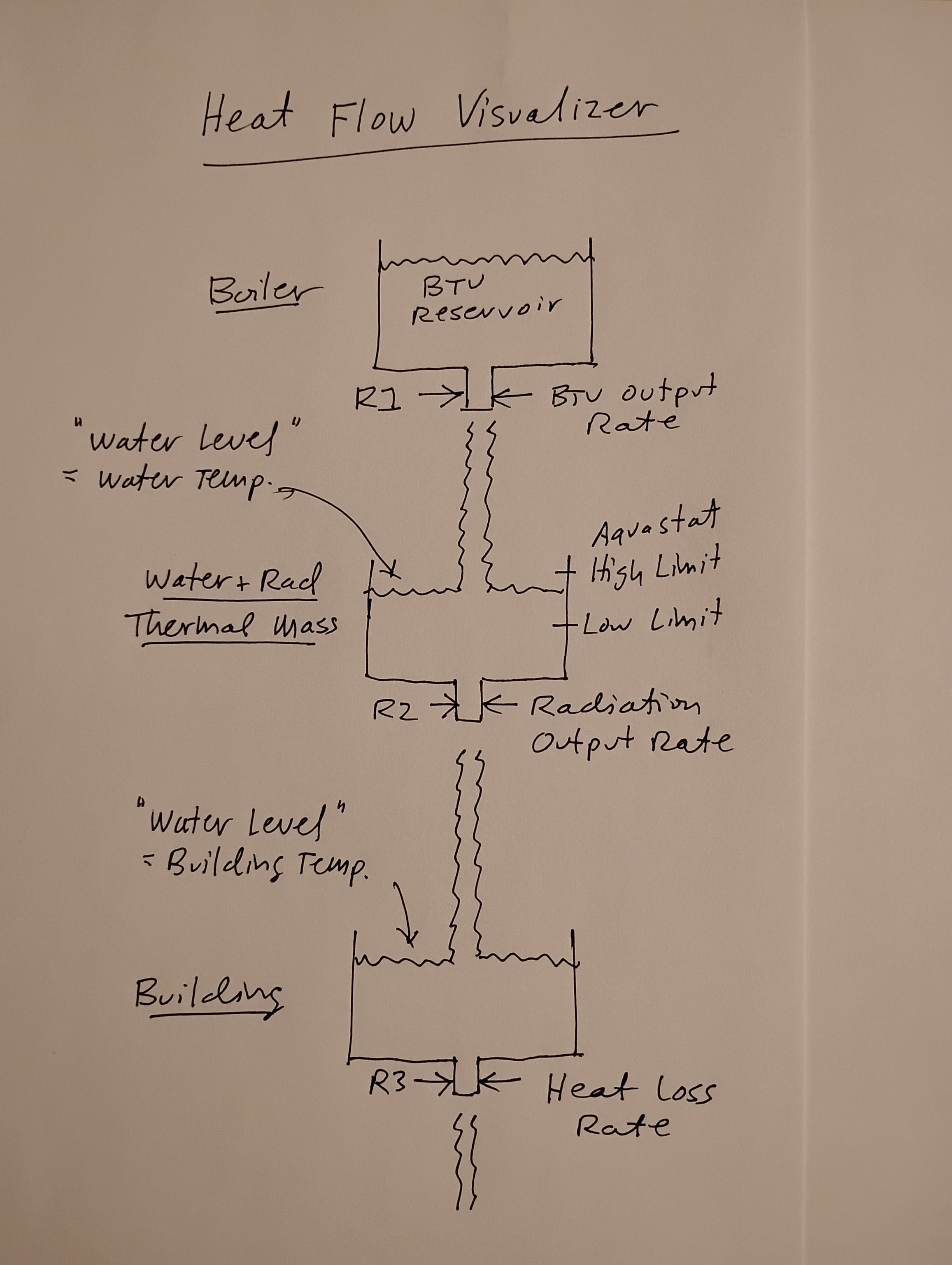 The boiler is illustrated by the first "bucket," which is a BTU "reservoir" whose output rate R1 is represented by the diameter of the output pipe at the bottom of the bucket.