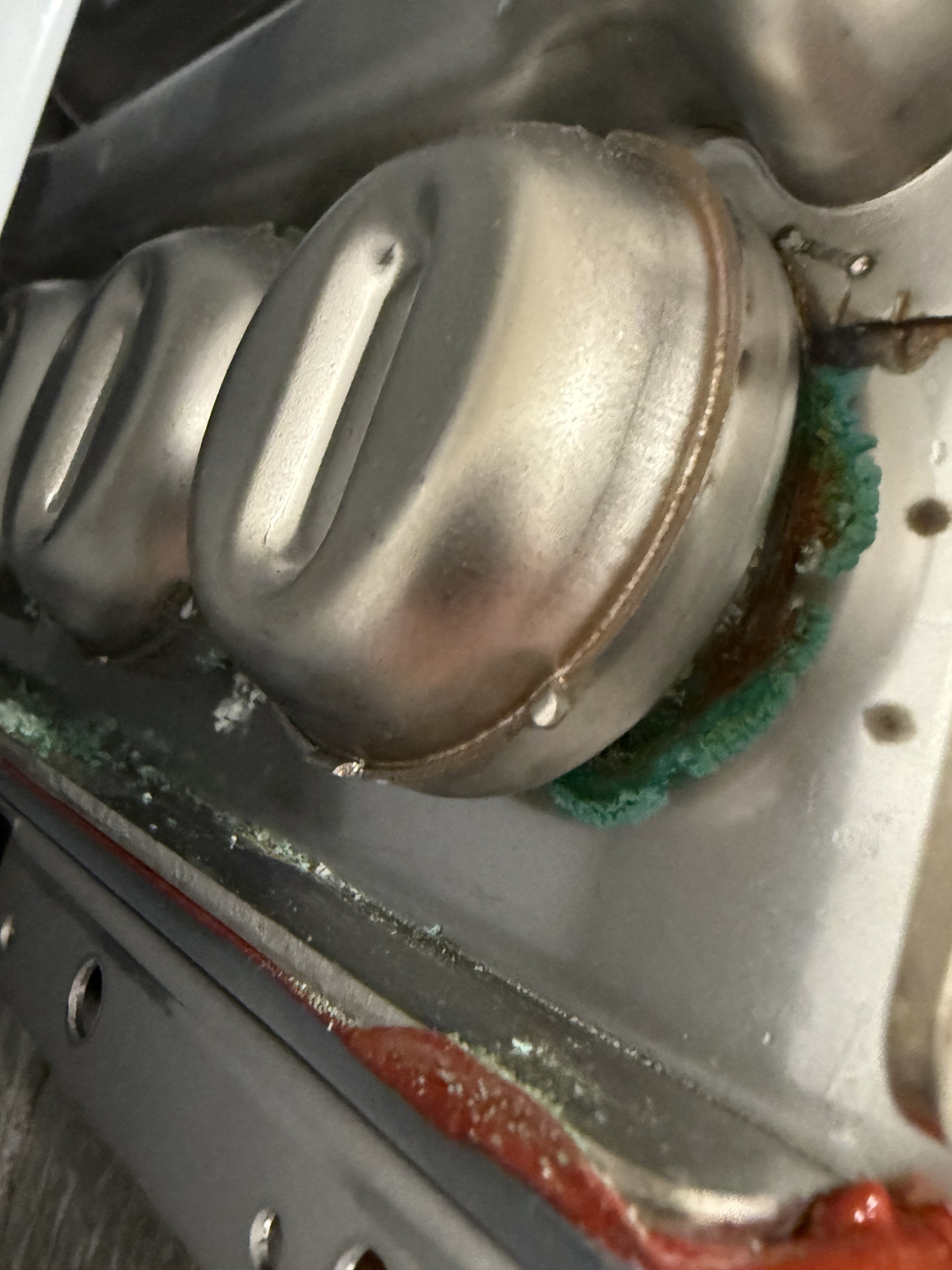 There is green/blue corrosion coming out of the ends of the primary stainless steel heat exchanger which is running the closed loop radiant. The secondary heat exchanger is running the municipal DHW appears to be fine. but it's covered with a material.