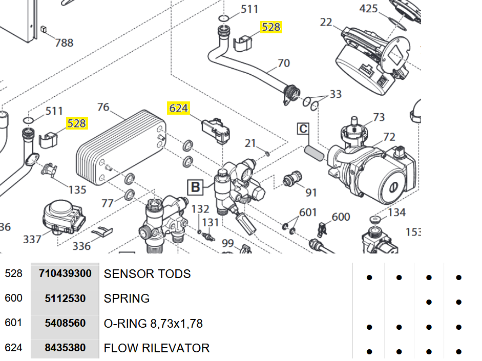 Seems both items 528 may be temperature sensors, the documentation is a bit confusing, apparently different physically and possibly electrically different from the other NTC temp sensors. 624 is a flow sensor but may only be used for DHW use.