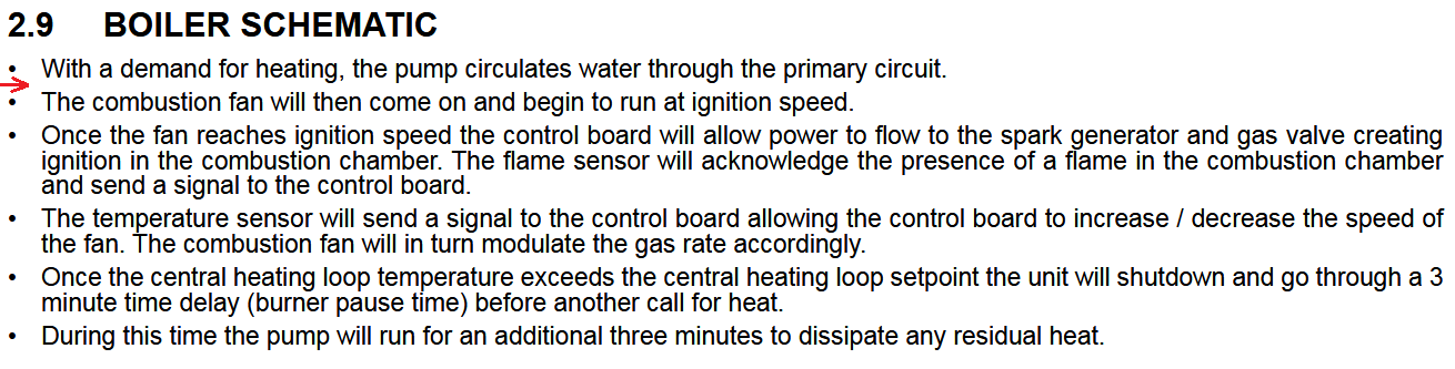 When the circulator starts the boiler wants to see a temperature change to verify the flow. Presently I would imagine all the sensor temperatures should be close to the same temperature since the boiler has not run in a while (Sanity check).