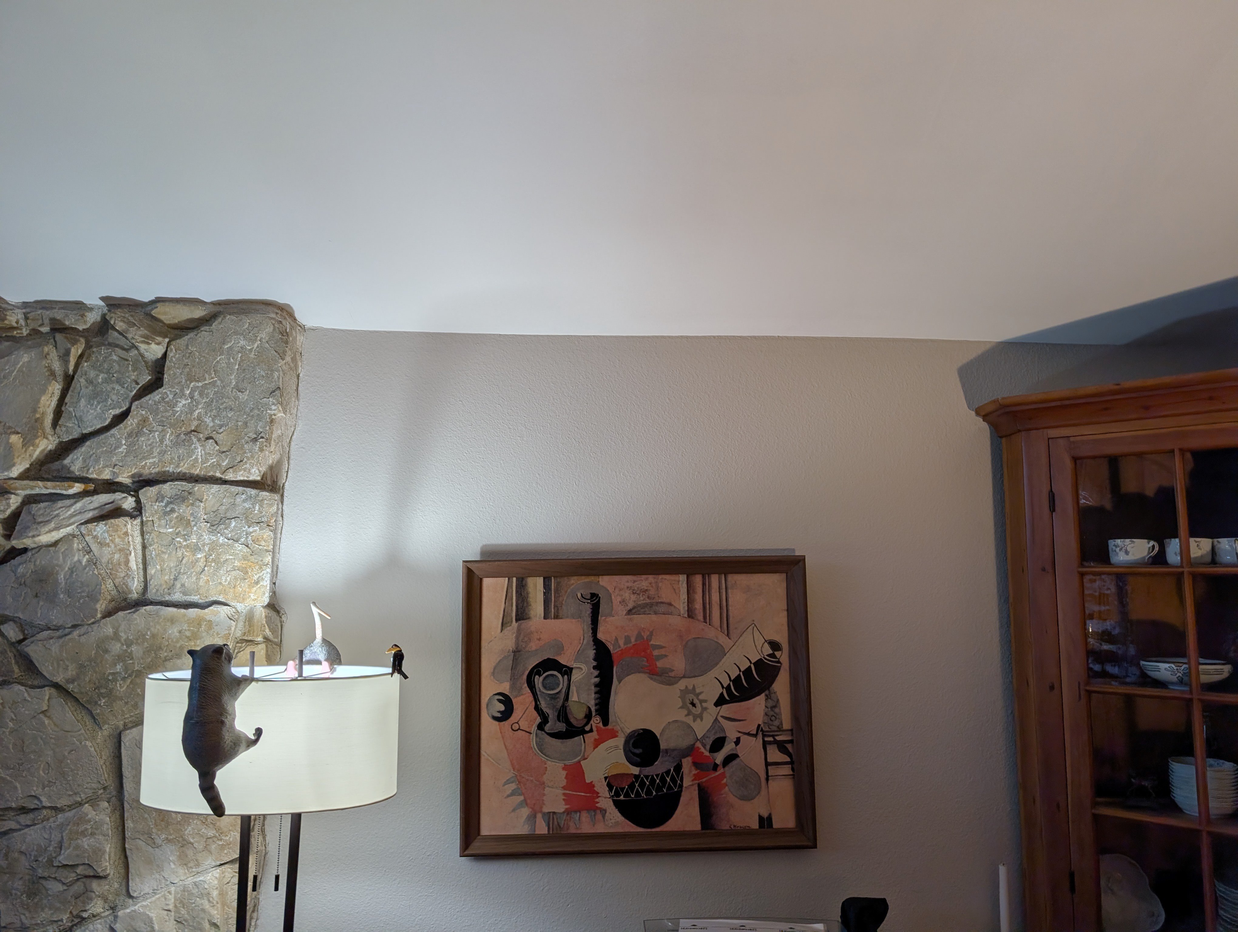 Pictured above is the south wall of our living room. Between the fireplace and the corner cabinet (only place in the house it works) and above the painting (print) is approximately 66" X 22". This is an exterior wall (second story) adjacent to the driveway and there are no obstructions on the outside. The electrical panel for the house is on the same side of the fireplace downstairs.