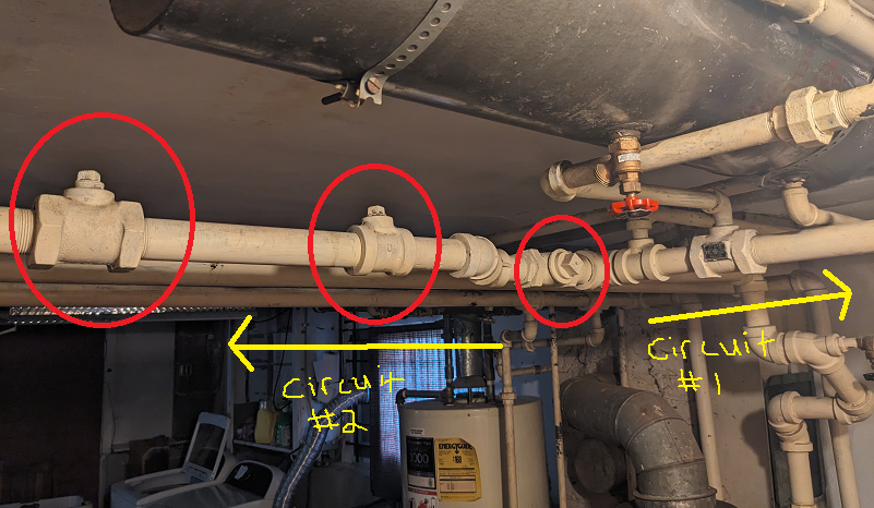 Also in the first pic, I additionally circled a shut off valve that is for circuit #2. Circuit #1 has no shut off valve. I don't understand why they added a shut off to just one circuit, but as you can see from the pic, the two circuits bifurcate in that area. I was thinking perhaps the shutoff was used while filling the system to make it easier to fill circuit # 1. Then they opened the shutoff to fill circuit number 2. Is that a plausible theory?