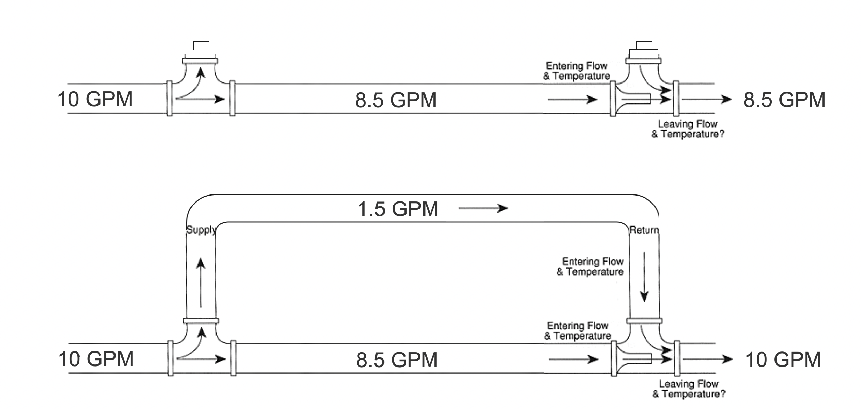 By adding a bypass pipe from the branches you do not restrict the entire main loop since the additional 1.5 GPM has a path to the other side of the tee restriction.
