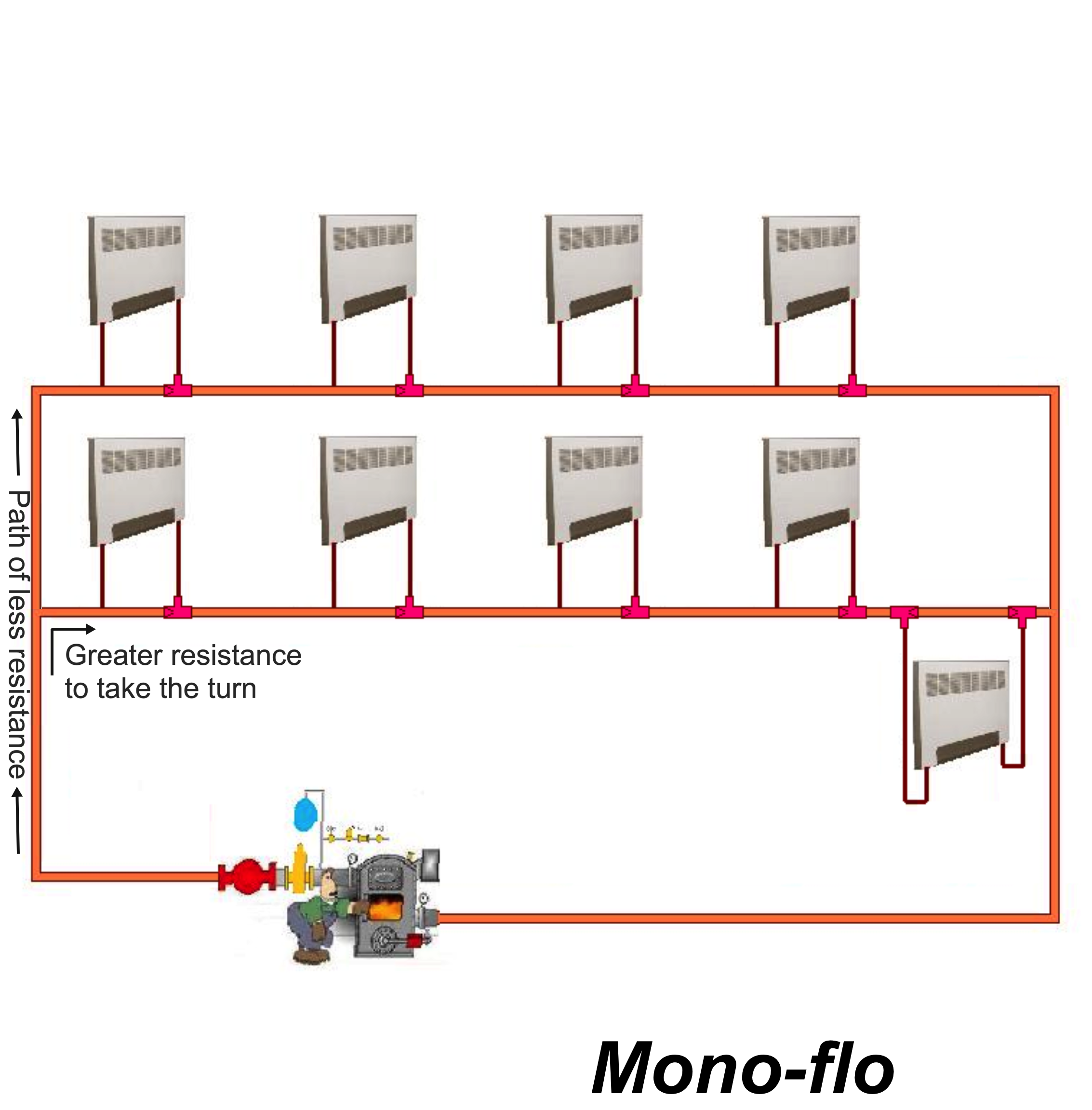 I have a Monoflo system from the 50s and I will be replacing the boiler with a Weil-McLain CGa-6 cast iron boiler. The system has two circuits, but only one circulator. While examining the piping, I came across two sections that I have questions about. Both of the sections have two unused fittings. One of the fittings is a Monoflo T and the other is a regular T. Myfirst assumption was that they were remnants from an old radiator that was removed. But perhaps they were strategically placed there to affect the flow rate.