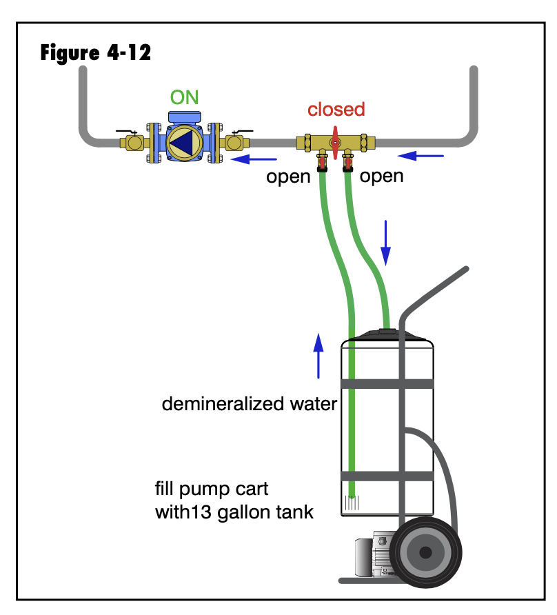 Pump into one valve, purge back into the tank from the other valve/ hose.