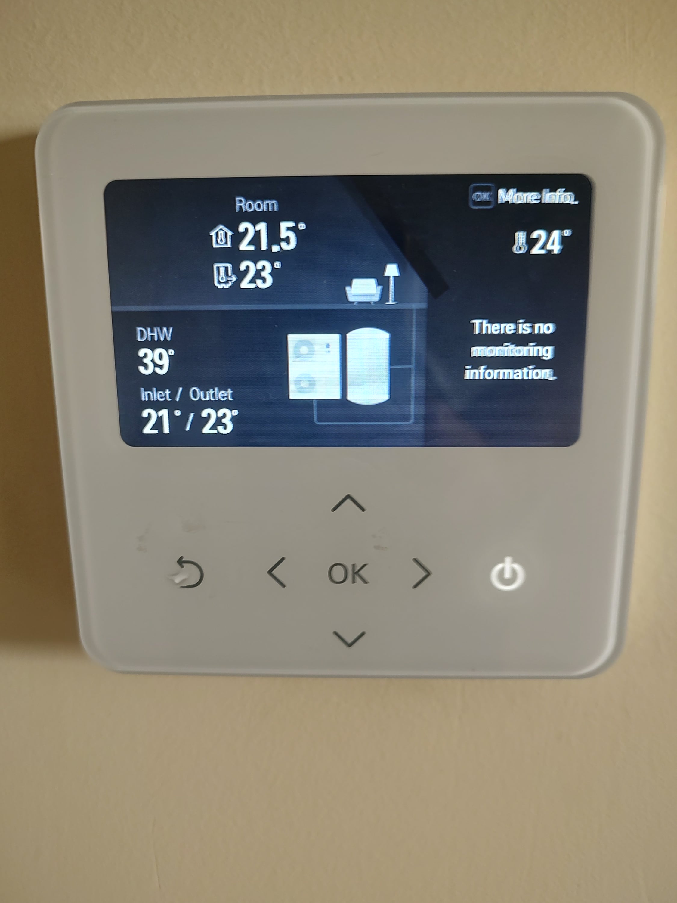 - Cooling/Heating off - DHW call: When a DHW cycle is called, the outdoor unit remains idle. The controller displays “There is no monitoring information” for the first 30 minutes.