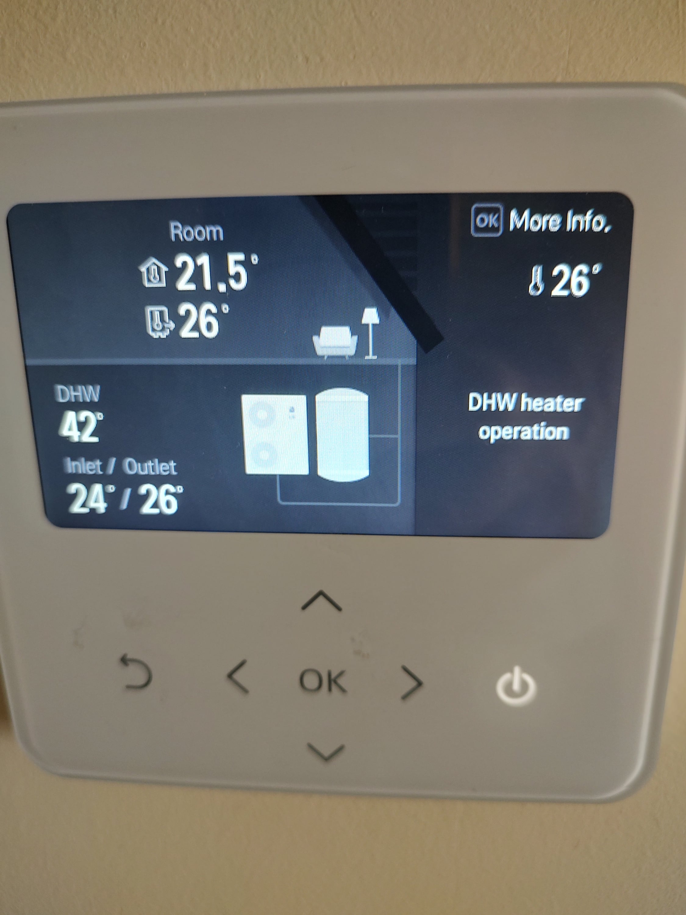 - Fallback: After the 30-minute delay, the internal immersion heater kicks in. The display then changes to “DHW heater operation”.