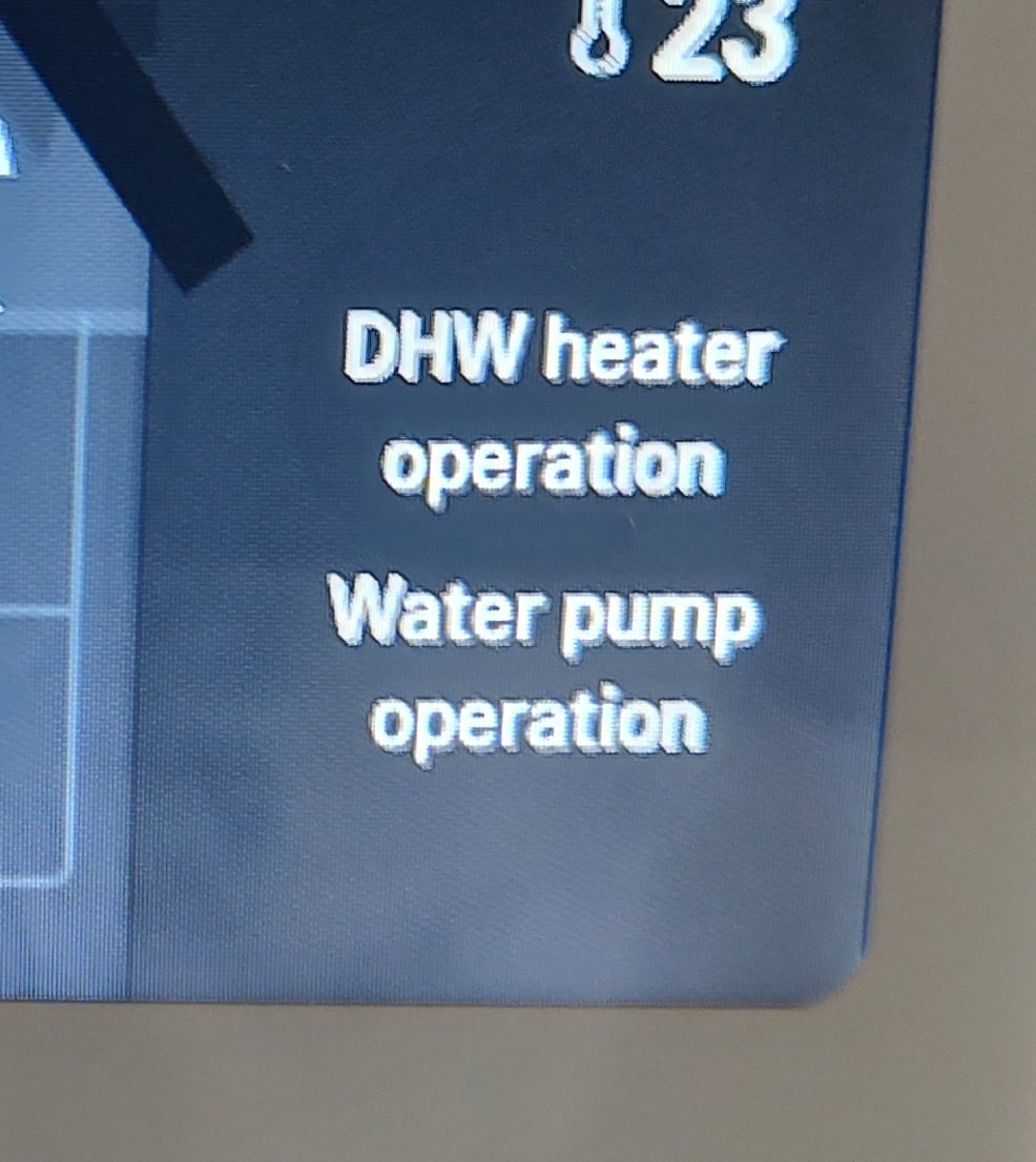 - Fallback: After the 30-minute delay, the internal immersion heater kicks in. The display then changes to “DHW heater operation” and “Water pump operation.”