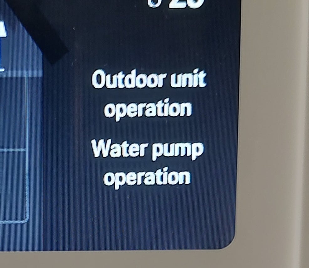 - Cooling/Heating on - DHW call: When a DHW cycle is called, the outdoor unit remains in heating/cooling mode. The controller displays “Outdoor unit operation” and “Water pump operation.”