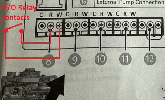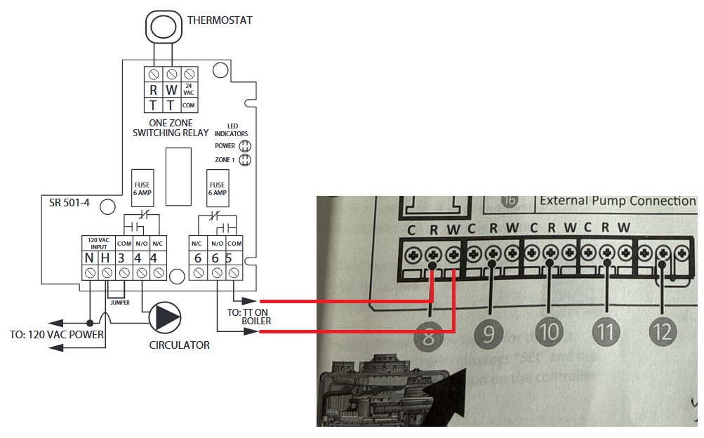 I understand the I-series boiler has a switch relay internally for single zone. I have already set up a switch relay and grundfos pump powered separately from my boiler. I have a tekmar smart thermostat already connected to the switch relay. I need to know how to connect my switch relay to the combi boiler. I am thinking the T/T 1 Connection at the boiler to the C and N/O connection at relay but the t/t conn has the three connections C, R and W. Is there a different place in this panel I should connect for call for heat when pump kicks on?