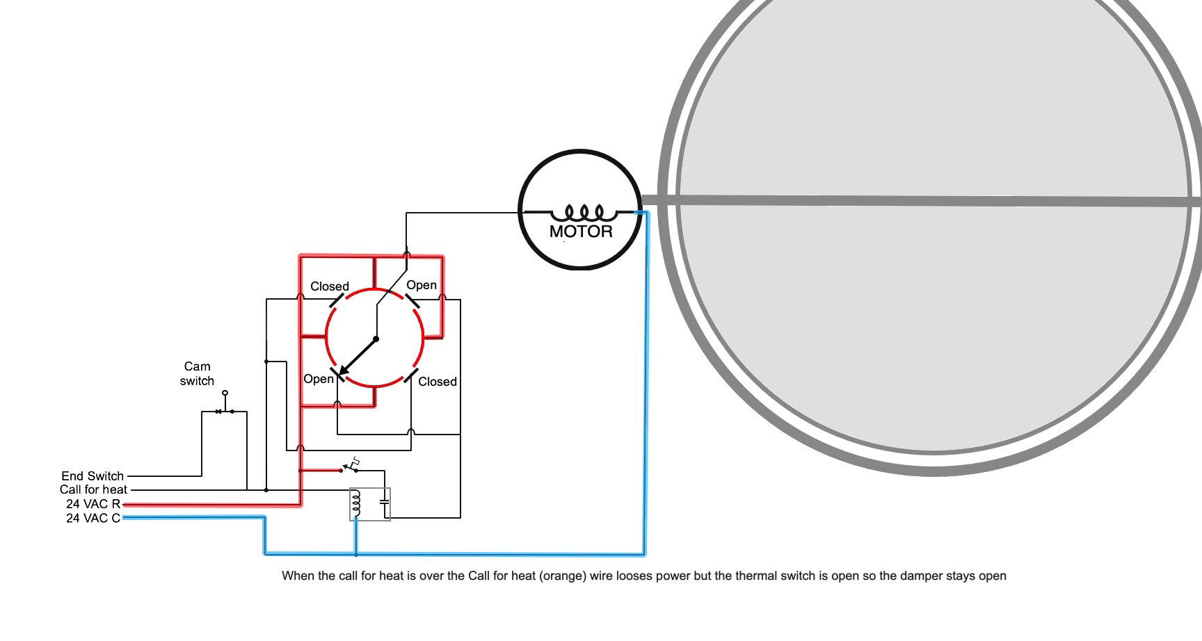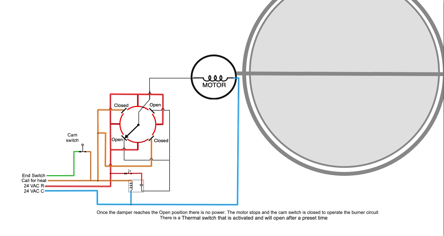 Eventually the thermal switch will close and power the open portion of the rotary switch. The motor will start and travel to the always hot portion of the rotary switch and finally end at the closed portion of the rotary switch then stop. The cam switch will open as soon as the damper motor starts to close the damper. EBEBRAT-Ed found this diagram in the instructions from 1995 and 109A_5 fixes the error on the diagram
