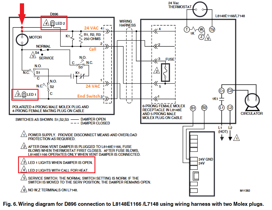 3and #5on the Molex mounted on the control. The factory installed jumper connects pin #2 and #3 in order to complete the “End Switch” circuit when a vent damper is not used. when a damper is connected the 6 pin has on more wire that @EBEBRATT-Ed did not include. the green wire (24v. hot orR) is connected to pin4andpin3Imagine Bubba at the service call: This has happened more than once before this wiring design was made standard. No heat and the vent damper cam switch (end switch) is the problem. So, Bubba jumps the switch to get the burner to operate and locks the damper in the open position (because he is too lazy to remove the damper) and you have heat. Later someone sees that the damper is locked open and does you a favor by removing the bracket that is keeping the damper from closing in order lower your fuel bill and save you money.