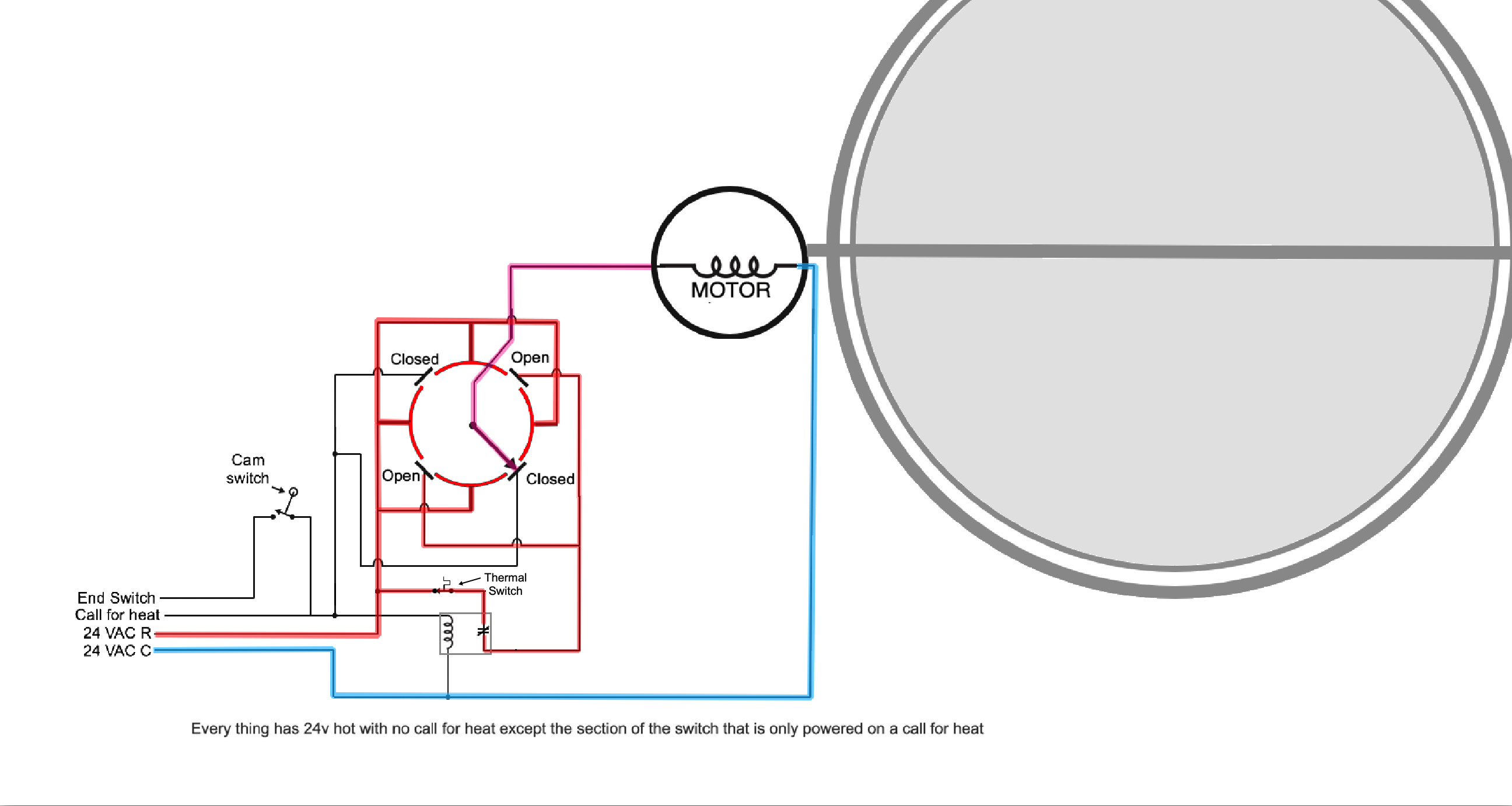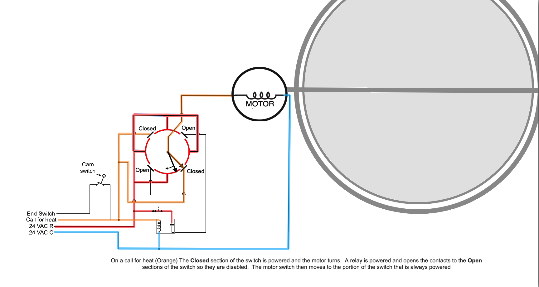 That call for heat causes three things to happen (See Orange wires). The Closed contacts get power to start the motor. A relay coil causes the power to the Open section to the rotary switch to lose power and the motor then reaches the “Always Hot” portion of the rotary switch so it continues to operate until it is completely open.