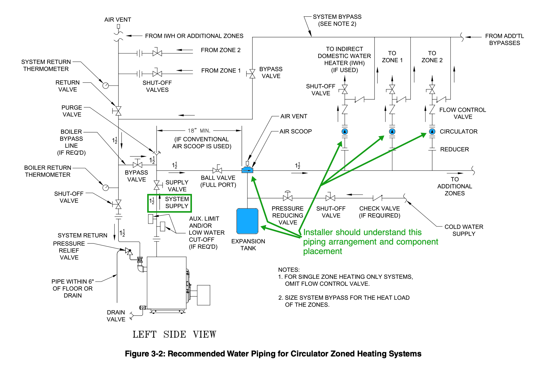 Take special note of this near boiler pumping arrangement commonly called Pumping Away. The order of the components shown in blue are crucial to proper air control in the closed system.