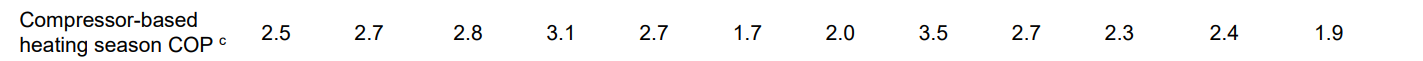 The DOE Field Validation Report does have the seasonal COP I mentioned, it’s just not what @Kaos referenced. Take the temperature/COP data points and hourly temperatures to estimate operating energy consumption and costs. Here is the quick analysis, without going into hourly impacts which is more revealing:
