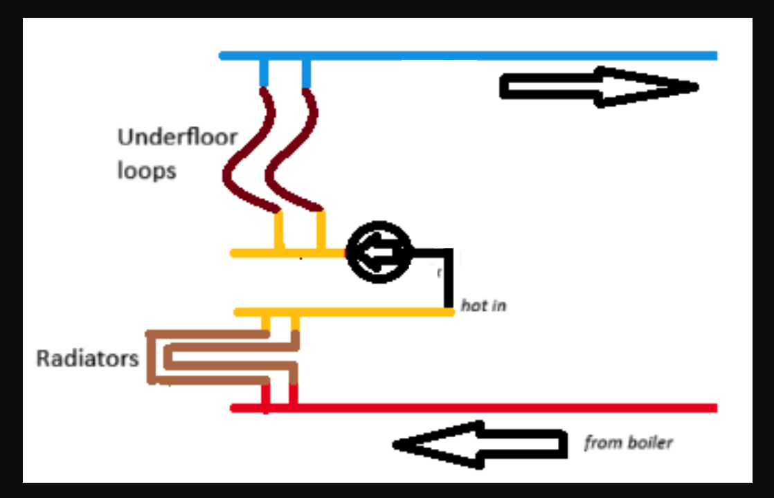 What I'm wondering is if something like this would be worth trying. I need to do the calculations to be sure, but I don't think the water returning from radiators will have lost enough temperature to drop below target temperature for underfloor. Apologies up front for the poor drawing.